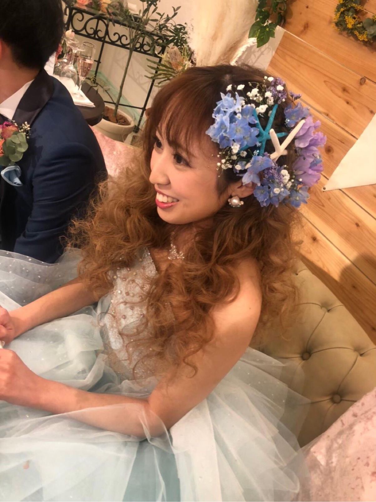 披露宴ヘア最初はアリエルになりきるために、ダウンヘア。ボリュームを出すために、上からミックス巻きにしてもらい、ふあふあにしていただきました。この日のために髪の毛を切らずに伸ばしていたので、ボリュームも良い感じに出てよかったです。アリエル同様、片方にヒトデや貝殻、生花をつけいただきました。