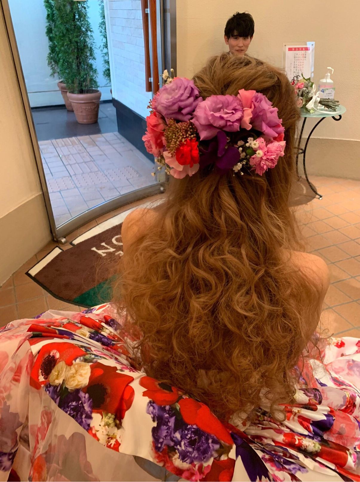 お色直しヘアは、ドレスの色味と同色の生花をつけたハーフアップ。ここでポイントにしたのは、写真映えするようにアップにする髪はなるべく少なく、ダウンの髪の量を増やし、ふあふあにしてもらいました。サイドの崩した編み込みも、可愛くお気に入りです。