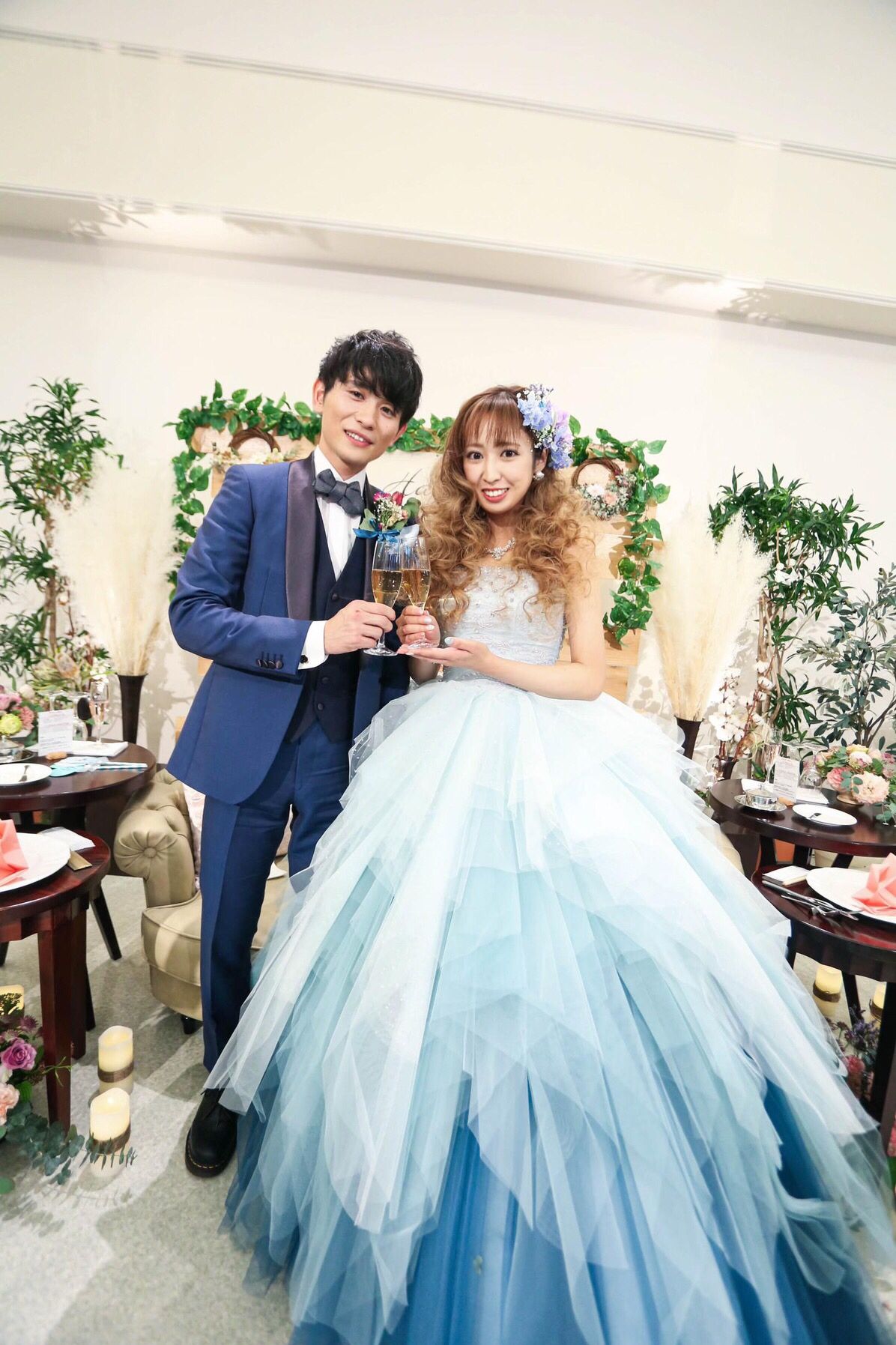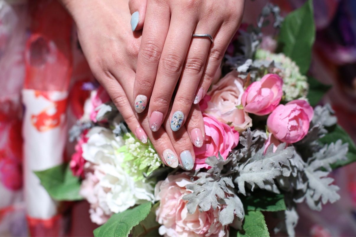 普段からお世話になっているネイルサロンで、ブルーと花柄のドレスに合うように、色味を両方取り入れてもらいましたが、ドレスを目立たせるために淡い色にまとめてもらいました。指輪をはめる指などは、ワイヤーネイルや押し花ネイルで華やかにしていただきました!