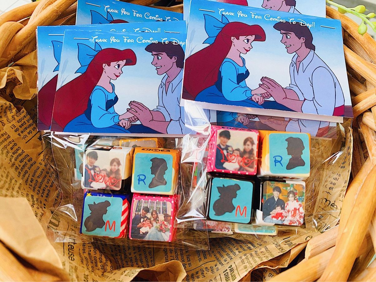 シールを印刷していただきそれをチロルチョコに貼って、袋詰めしました。袋にもこだわり、アリエルとエリックのにしてもらいました。