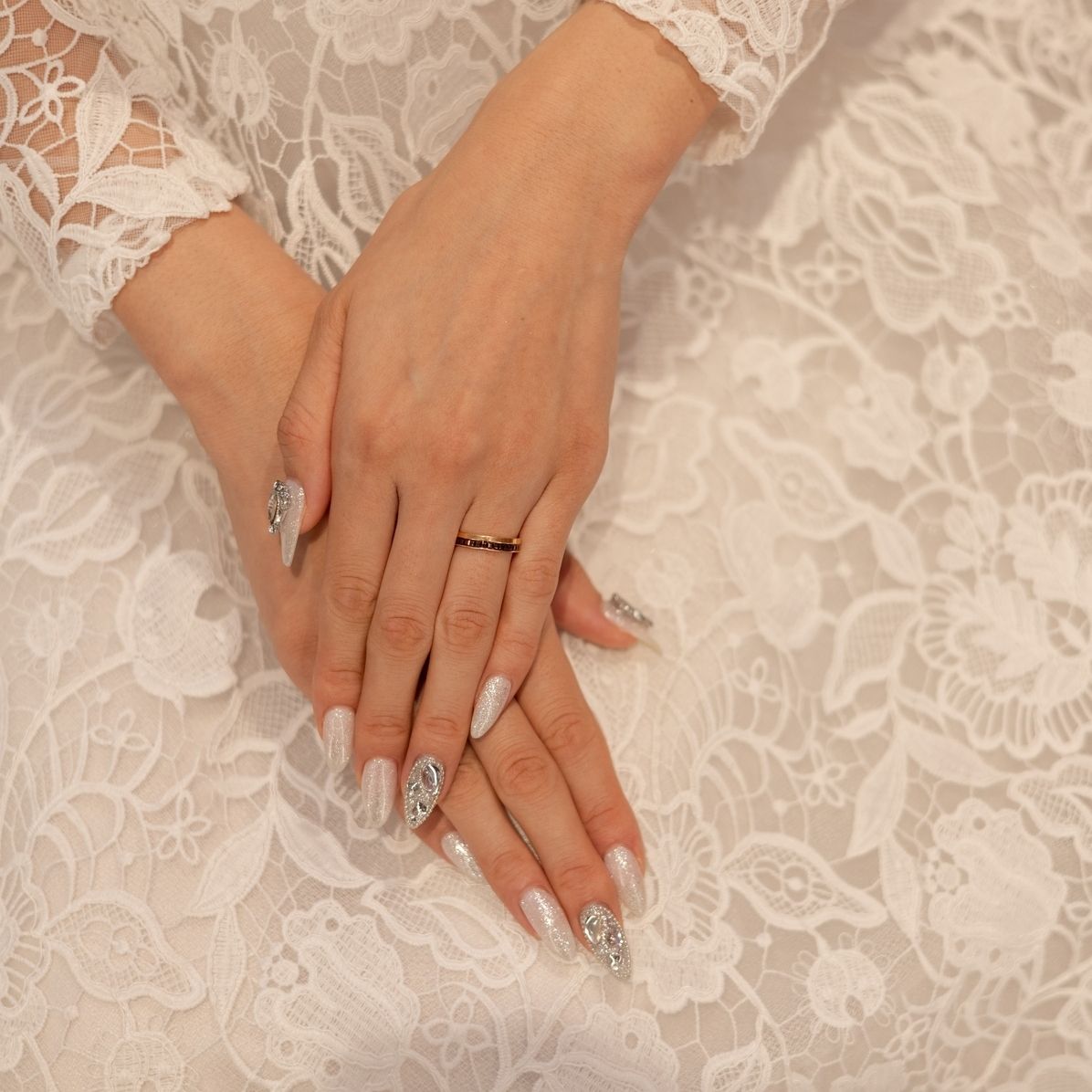 ネイルはウェディングドレスのことだけを考えて、とにかくプリンセスのようなキラキラしたネイルにしたいと思い、手元がとても目立つくらいキラキラさせてもらいました。