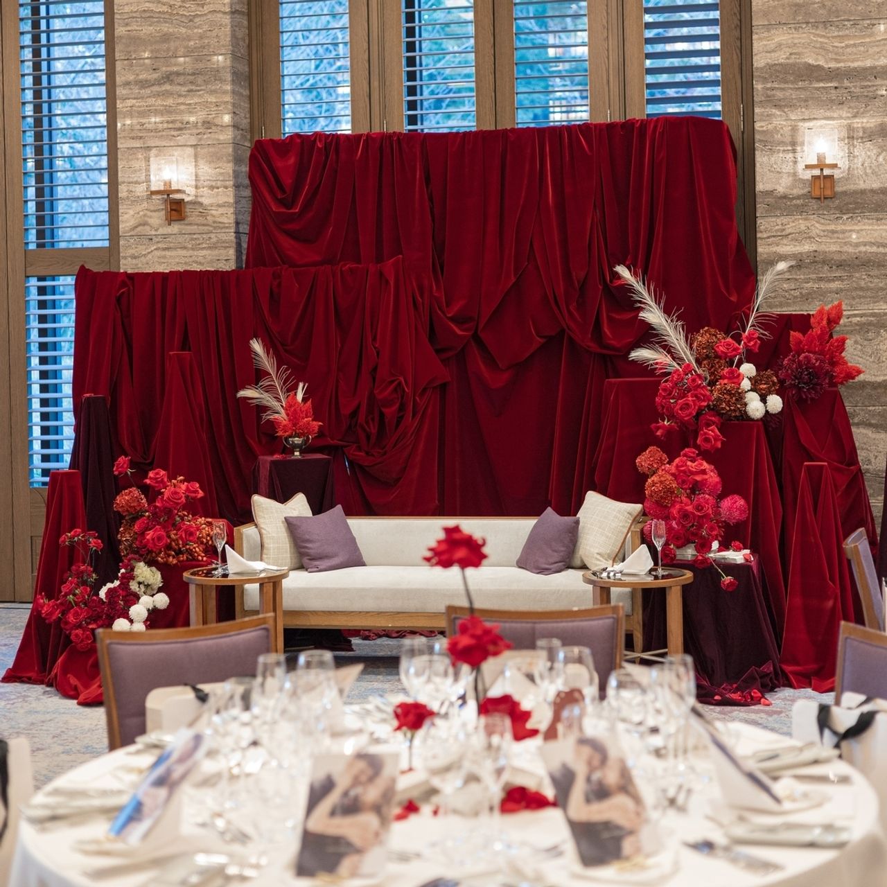 披露宴会場は高砂のボリュームを出したかったので、布をうまく使ってもらいながら赤い花をベースで作ってもらいました。