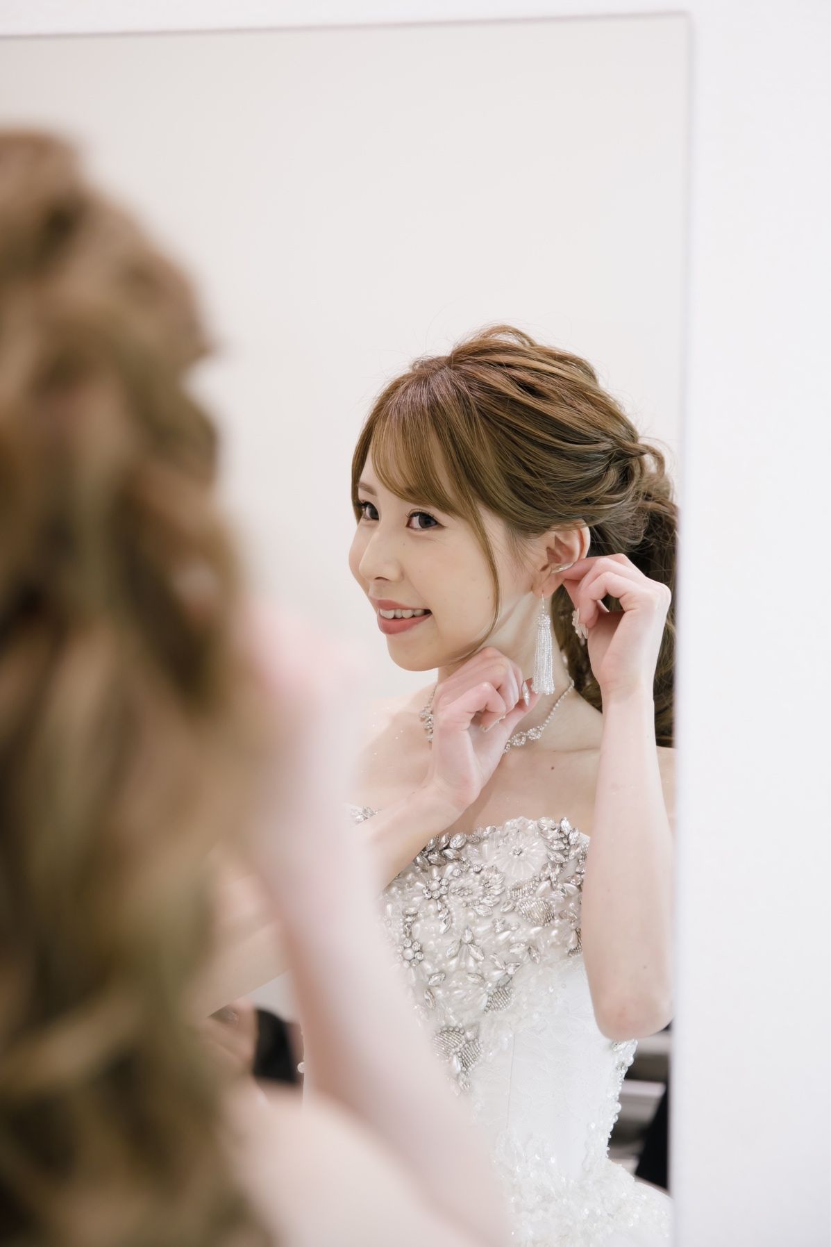 挙式はビーズフリンジピアス、披露宴はしずく型のビジューピアス、お色直しでは二十歳のお祝いで母から貰った真珠のピアスです。