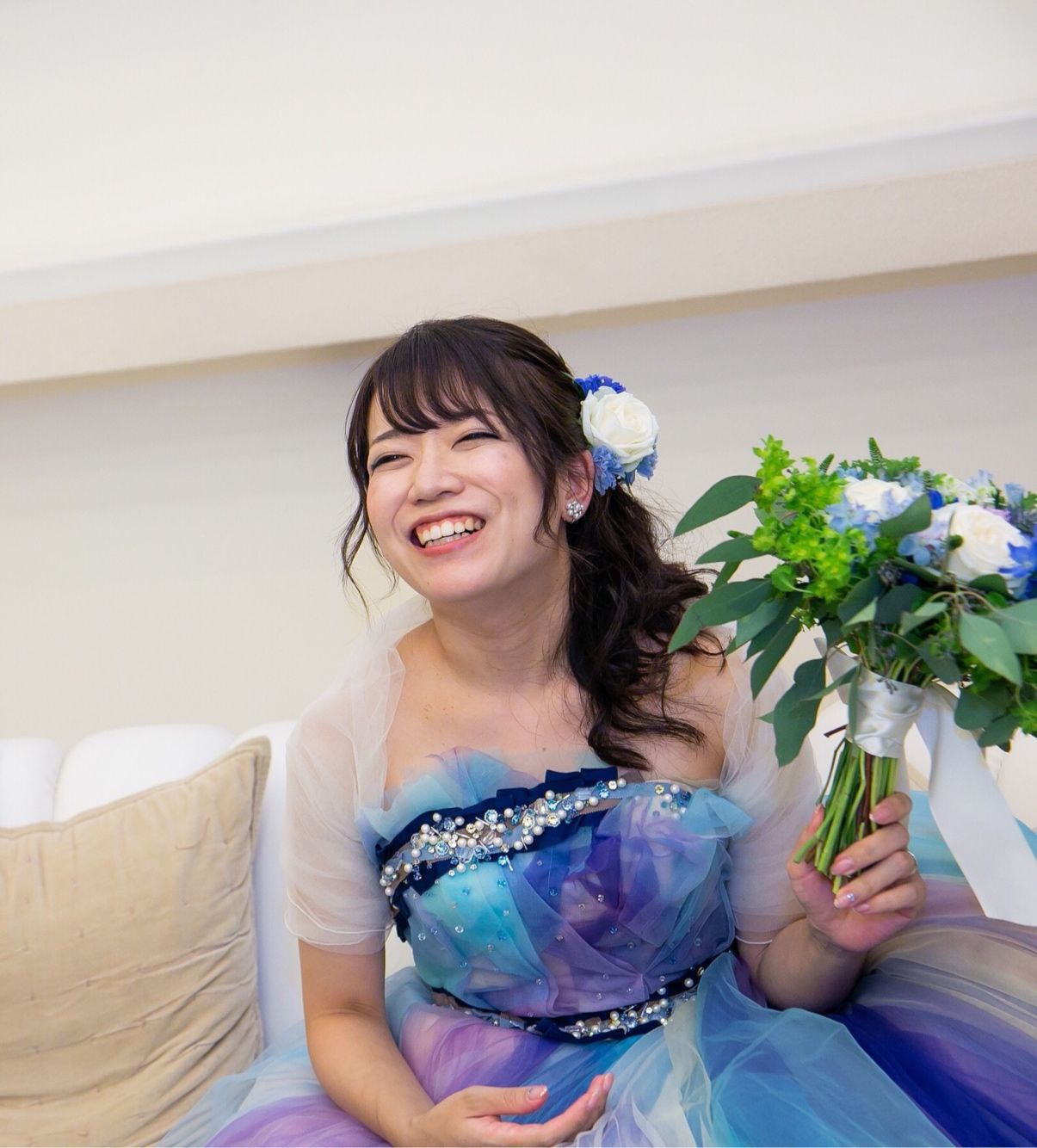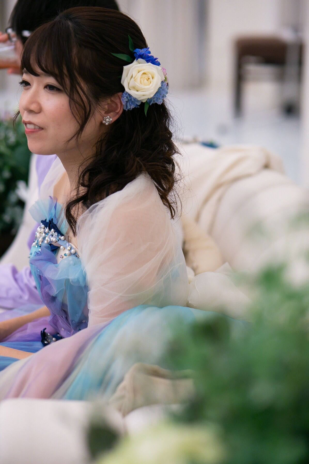 2着目にはドレスに合わせた色の生花を髪につけていただきました。