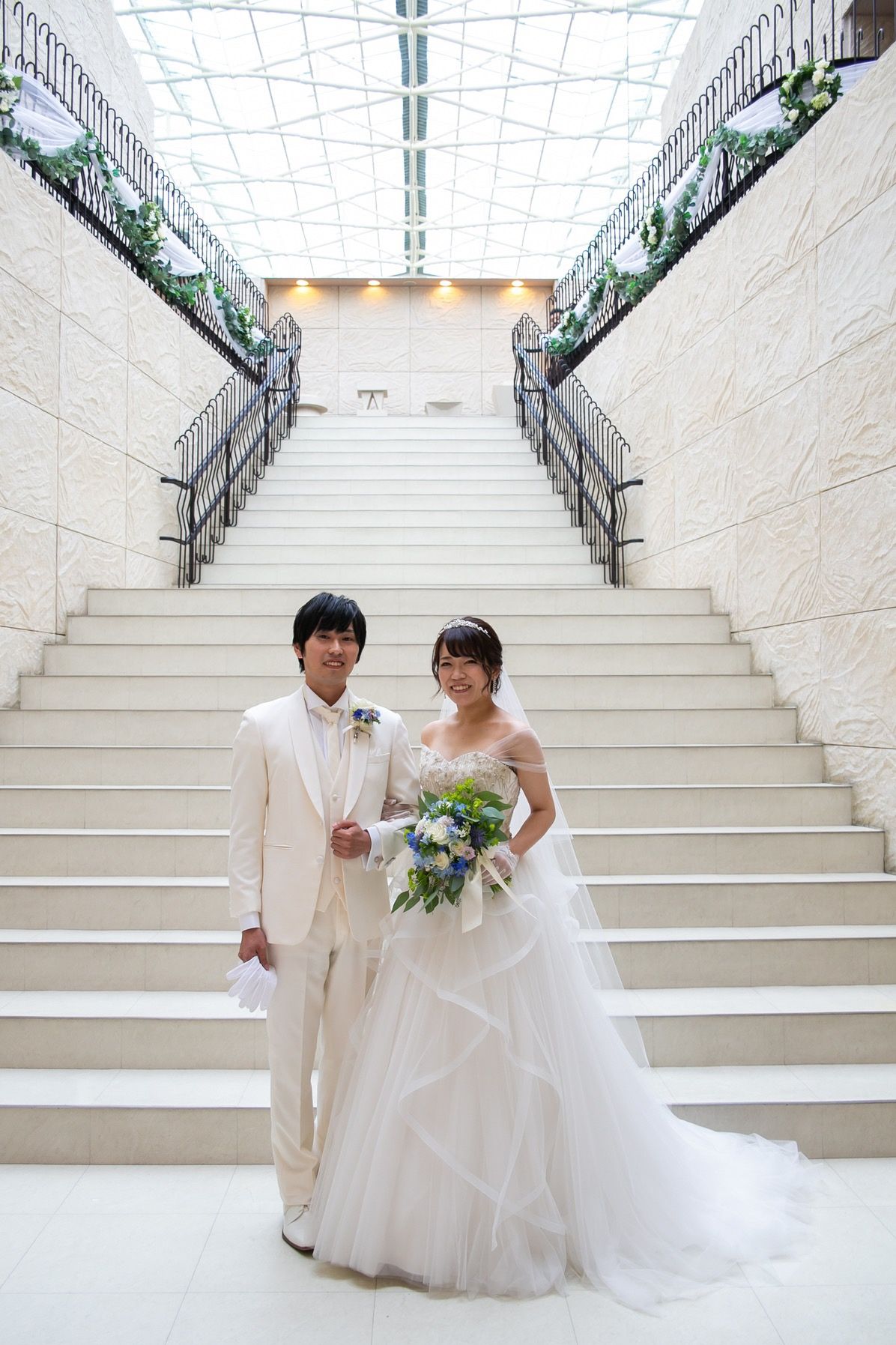 お花の種類はすべてお任せにしていたので詳しくはわかりませんが、白&グリーンのナチュラルテイストをベースに、ポイントでカラードレスのメインカラーである青&紫のお花を入れてもらいました。
