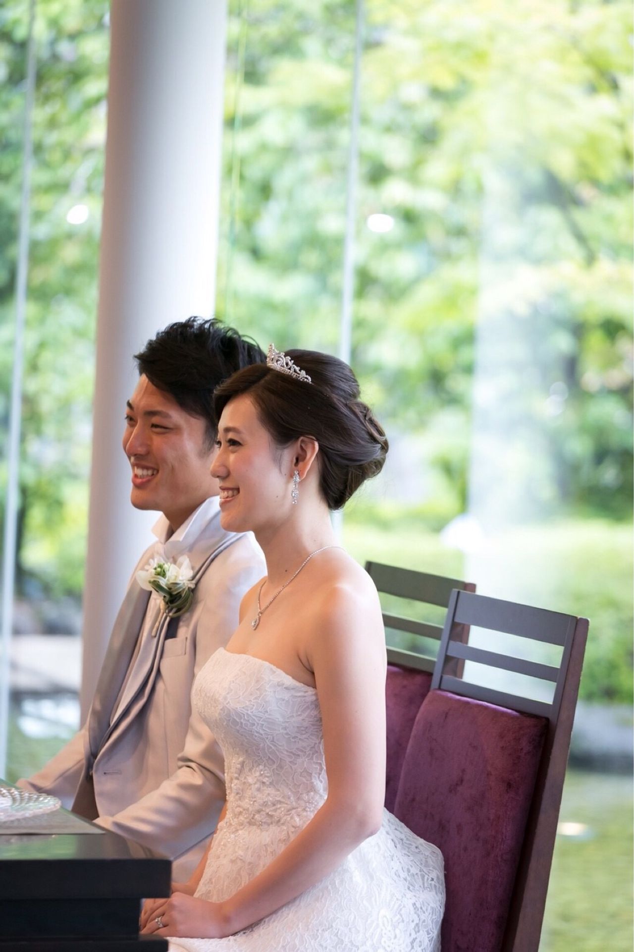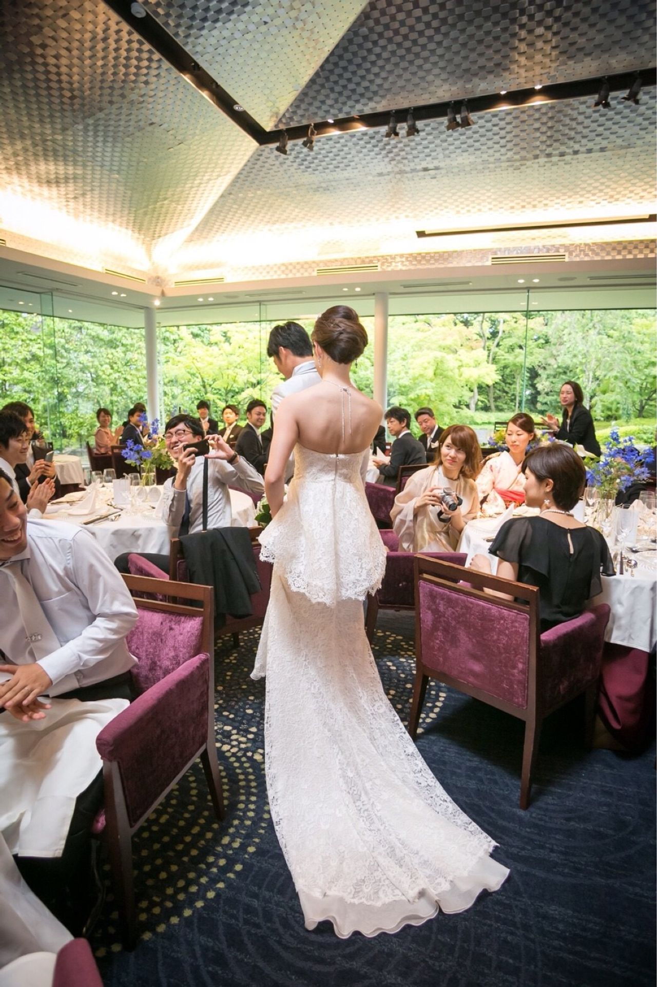 チャペルと同じく、ガラス張りの披露宴会場で、高砂の後ろは日本庭園。写真はどこからとっても明るく、緑が溢れていました。