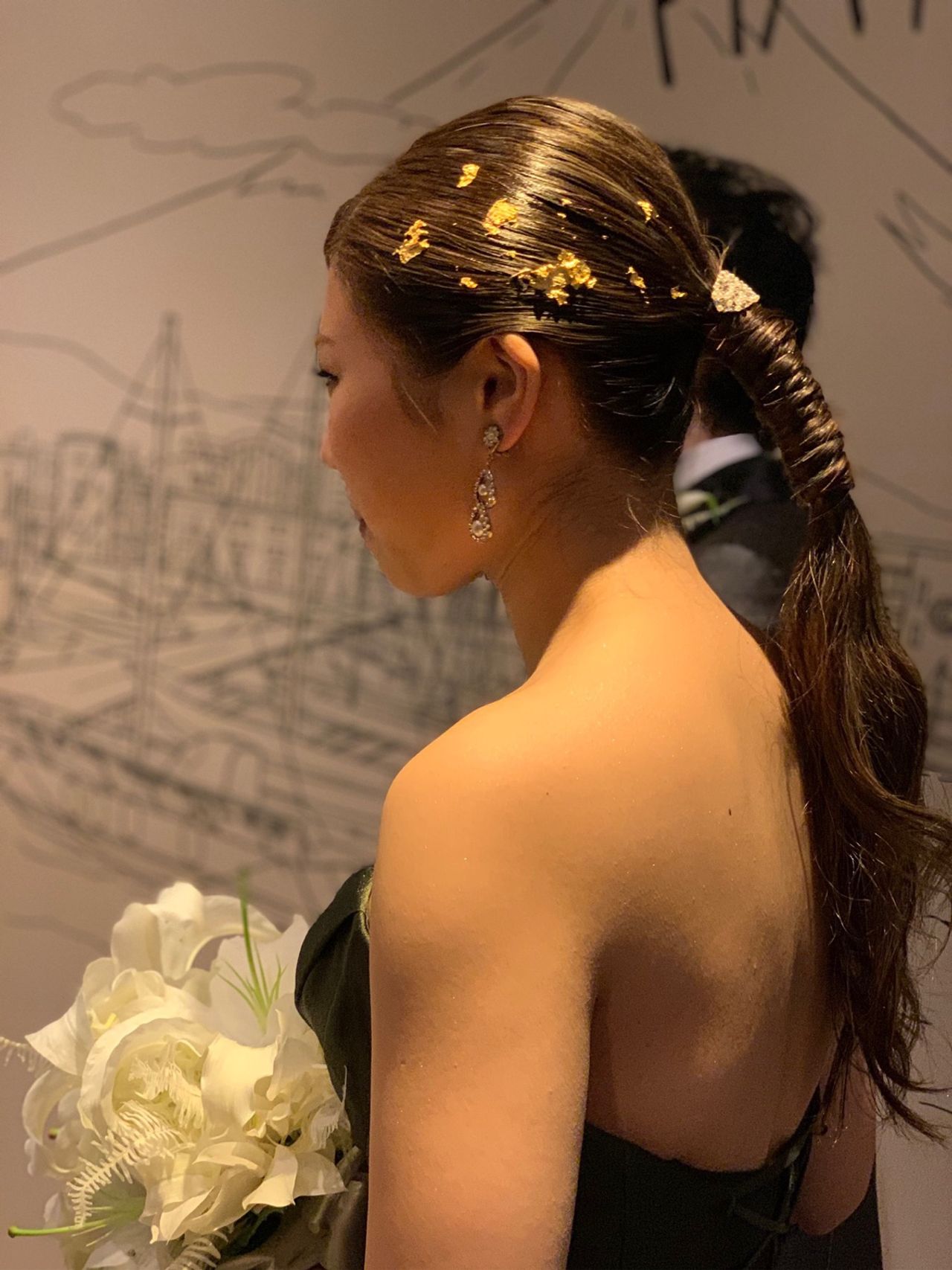 1着目には大きめのヘアアクセとイアリング