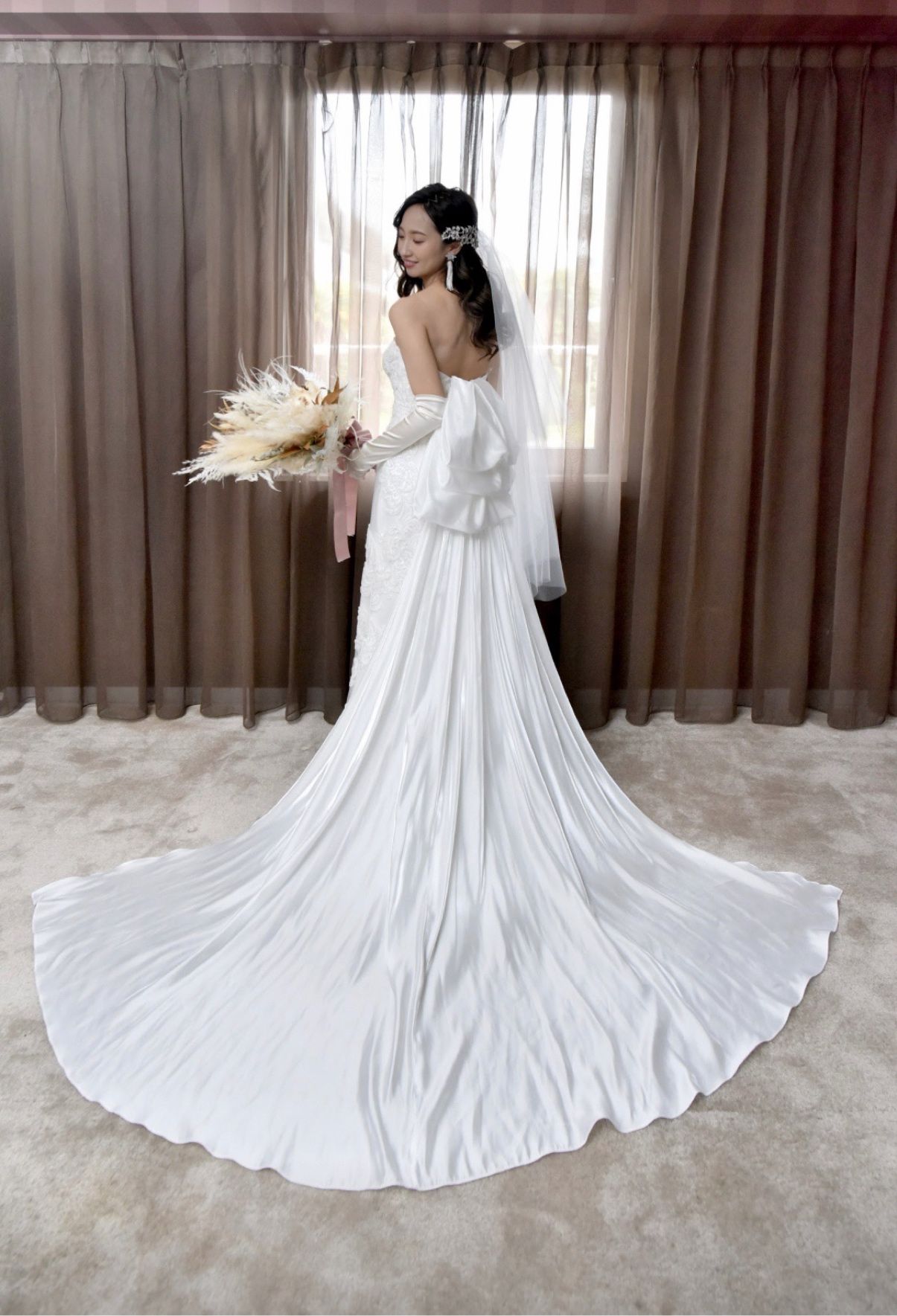 余分な装飾がなくさらっと着られるマーメイドが好きだったのと、髪型をダウンスタイルにしたかったので下半身にできるだけボリューム感のないマーメイドを選びました。トレーンは挙式入場はつけて、その後外す予定としました。