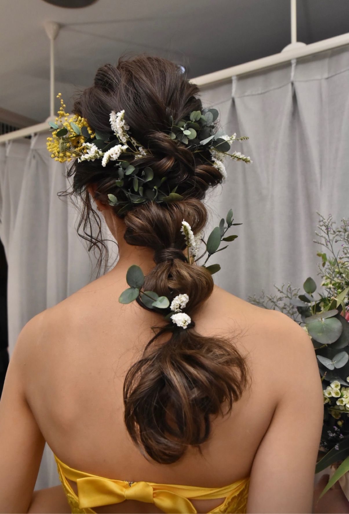 3着目はユーカリが好きで、ブーケにも沢山使用していたためプリザーブドフラワーのユーカリ、そしてスターチスを使用しています。また華道の先生よりミモザのドライフラワーをプレゼントして頂いたのでそれらの花を自身でDIYしてヘッドパーツにしました。