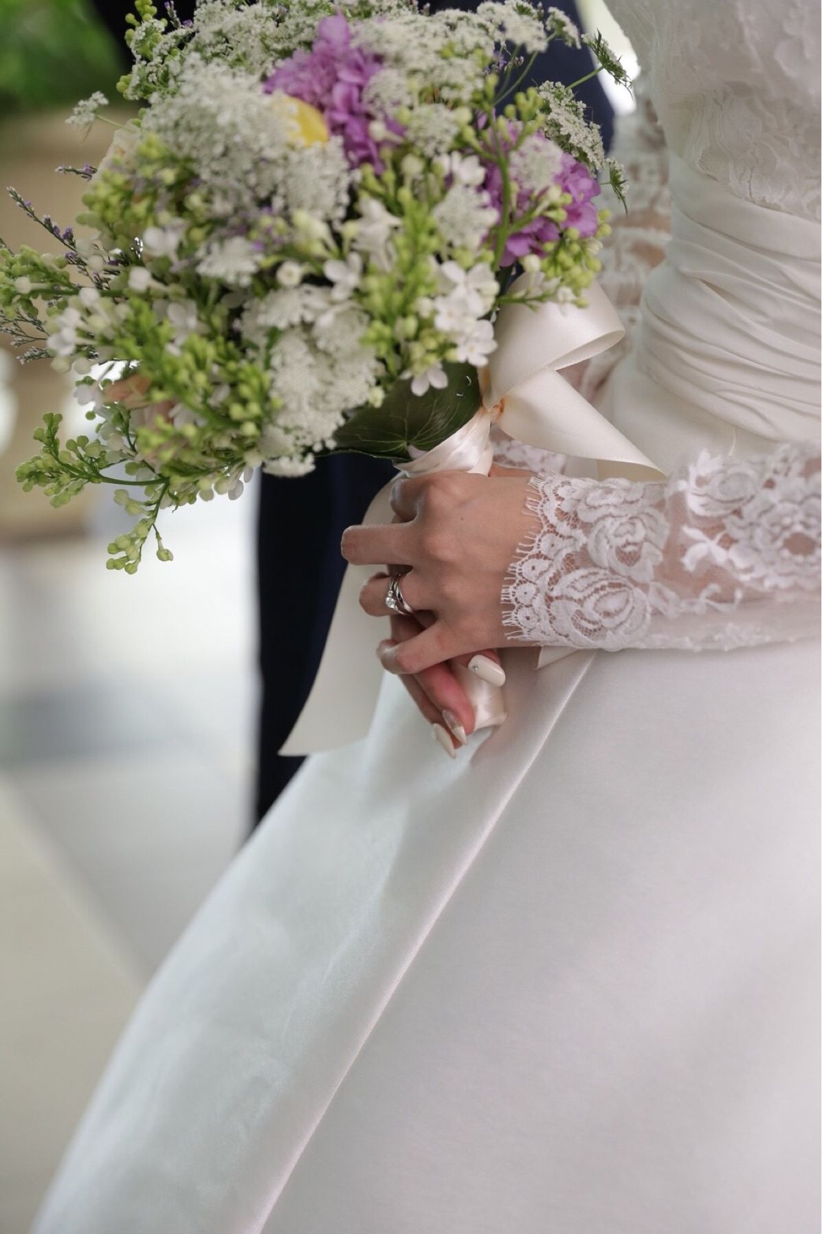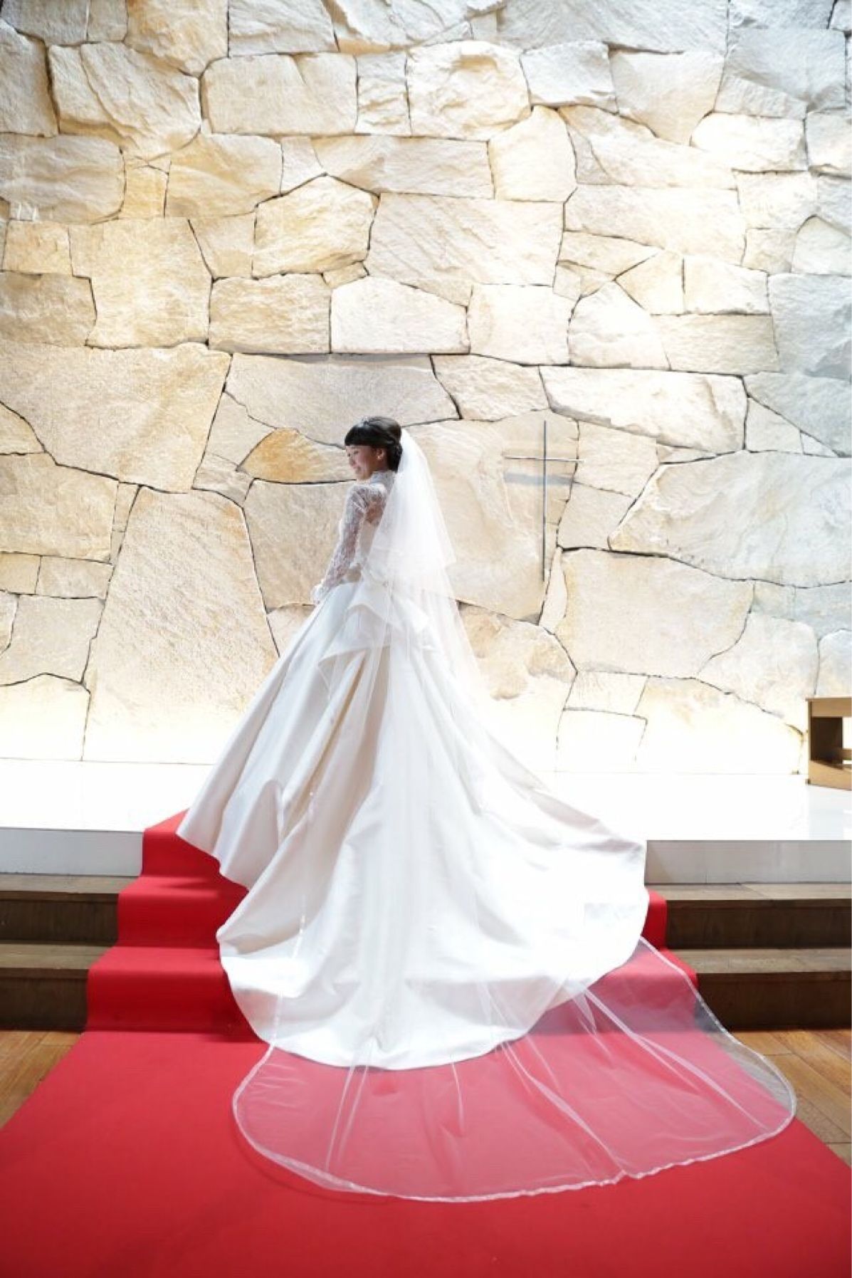 袖付きを着たいと思ってて、たどり着いたのが選んだドレスです。首からレースになっていてバックにもリボンがついてて、かわいいって要素もあるけど品があるようなところが決め手でした!!