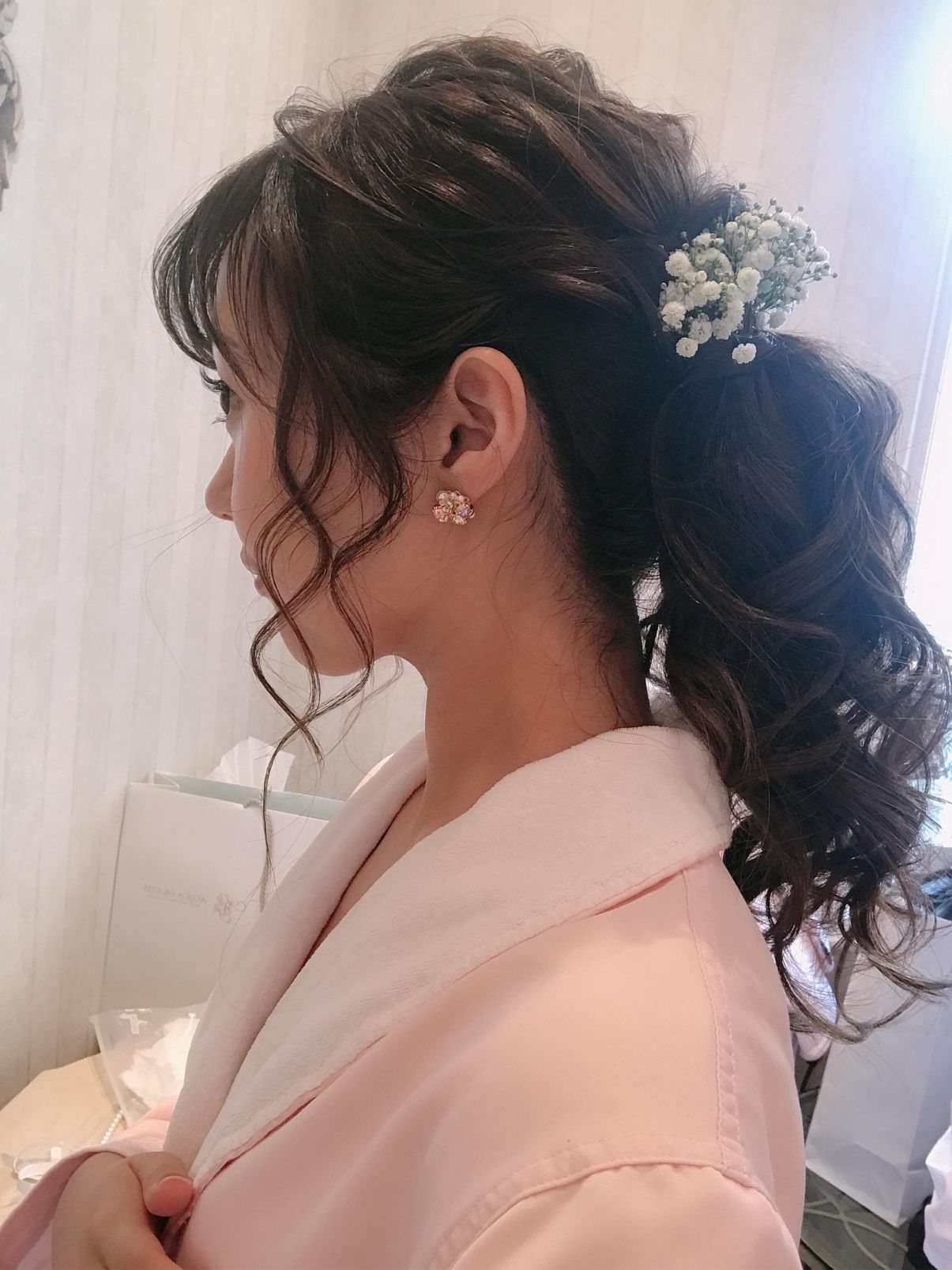がらっと変えてポニーテールで、ヘアアクセは生のかすみ草にしました。