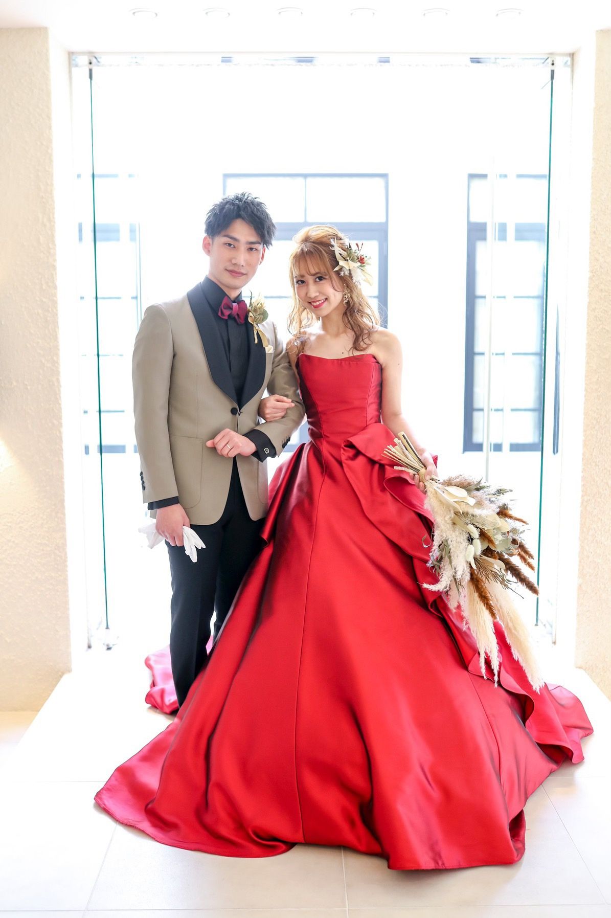 披露宴でのカラードレスは憧れだったワインレッドにしました。所々内側にブラックが入っていて、歩く度に見えるところがかっこよくてポイントでした。