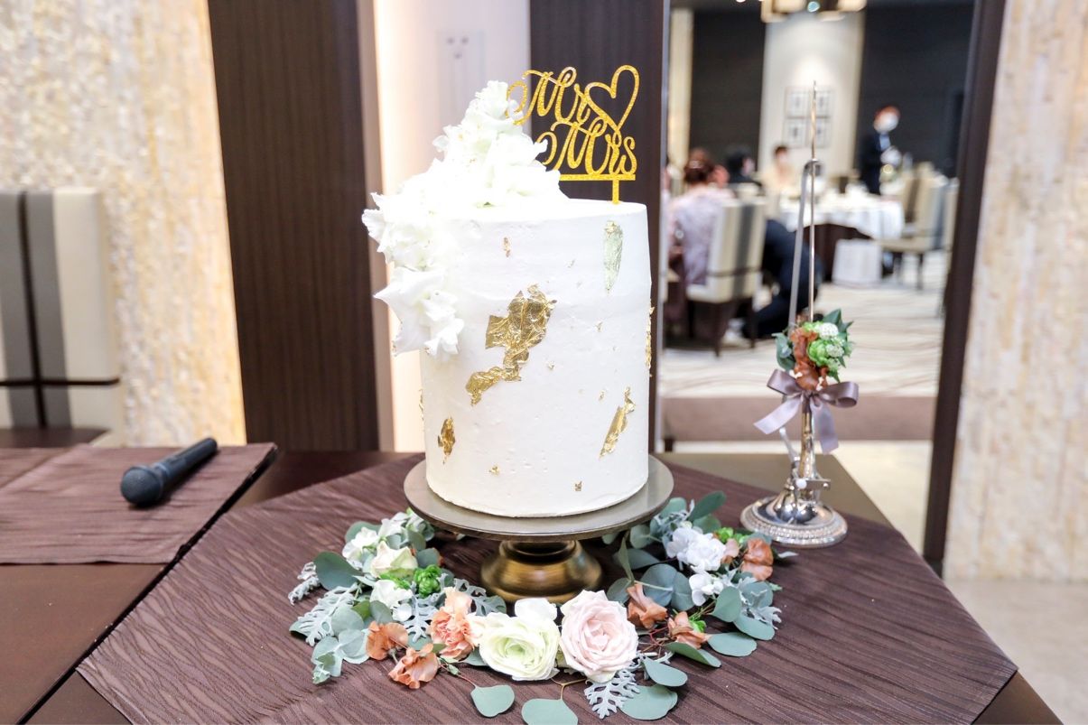 シンプルが良かったので王道な苺フルーツにはせず、真っ白のケーキに金箔と薔薇を載せて、上にはゴールドのケーキトッパーを装飾しました。