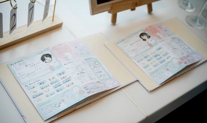 席札は空のデザインに、会場の装花やテーブルクロス、ナフキンの色は青と白を中心に。小物や小道具なども"空"に関連するものを取り入れて統一感を出しました。