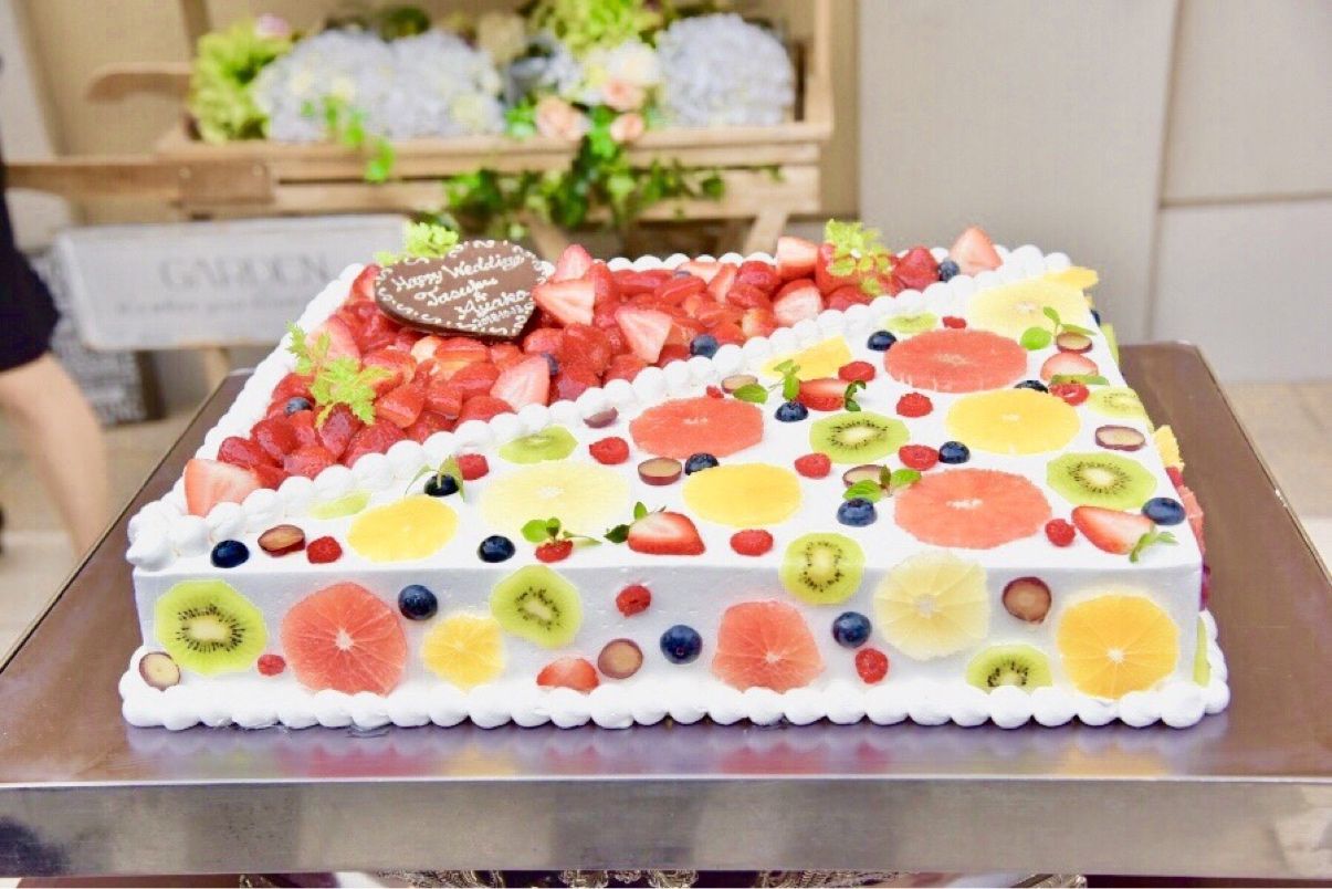 断面ケーキとイチゴのケーキが半分ずつになったスクエアケーキにしました。