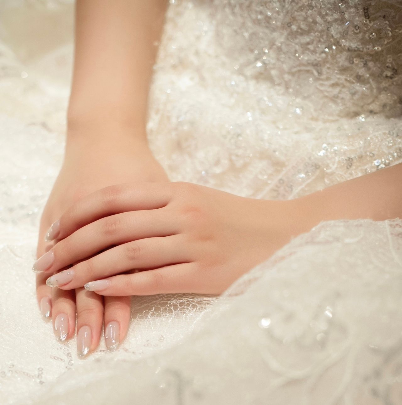 総スパンコールでほんのりピンク味のあるホワイトが肌色を明るく見せてくれ、一目惚れしたドレスでした。とにかくキラキラしていて、プリンセスラインの形が綺麗なところがとても気に入っています!