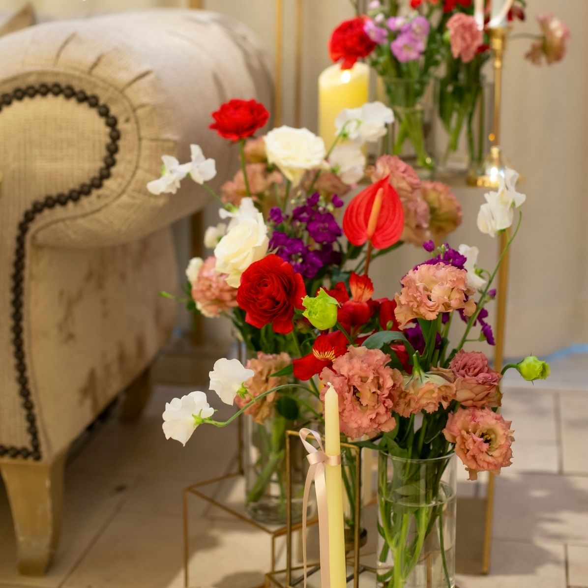 装花の打ち合わせを3回行い、海外のウェディングパーティーのような赤、白、ピンク、緑などを取り入れた装花にしています。当日理想通りの装花で感動しました!