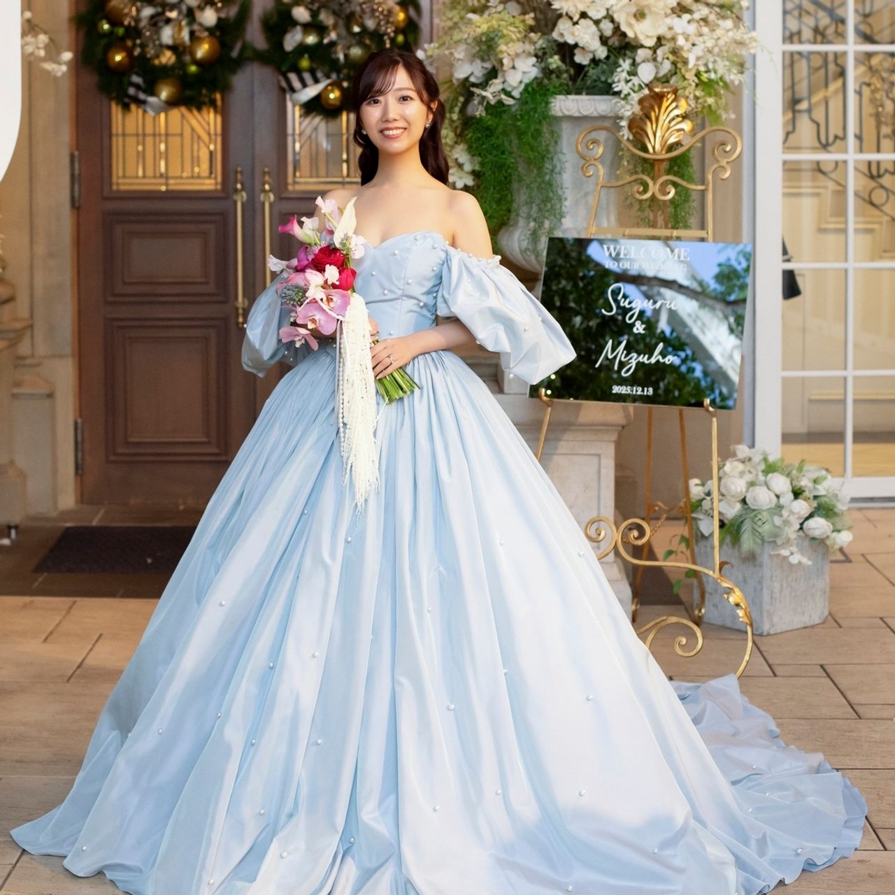 シンデレラのようなスカイブルーに、パールが散りばめられていて、オフショルダーとドレスの形がとにかくかわいいところが気に入っています!