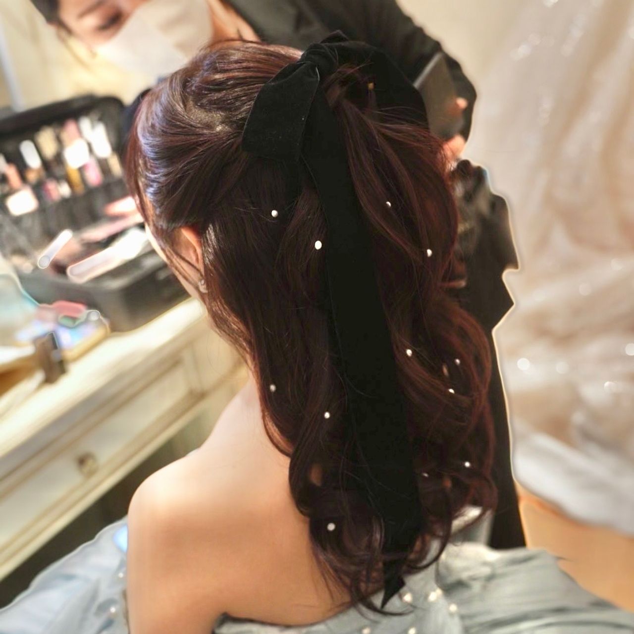 ウェディングドレスはアップシニヨン。カラードレスはハーフポニーにし、黒のベロアのりぼんとパールシールをつけ、アイメイクで少し色を足して変化をつけました!