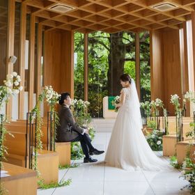 大きな窓からシンボルツリーが正面に見え、緑に囲まれたとても素敵なチャペルです🌳