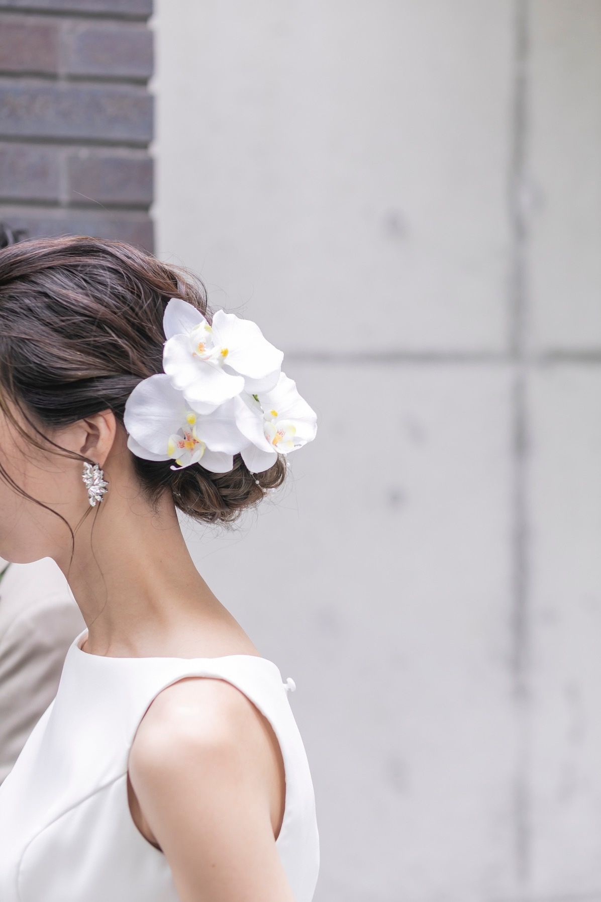 友人が作ってくれたものを使用しました。ウェディングドレスでは胡蝶蘭とヘッドドレスを合わせ、カラードレスではドレスに合わせた色の花を散りばめました。