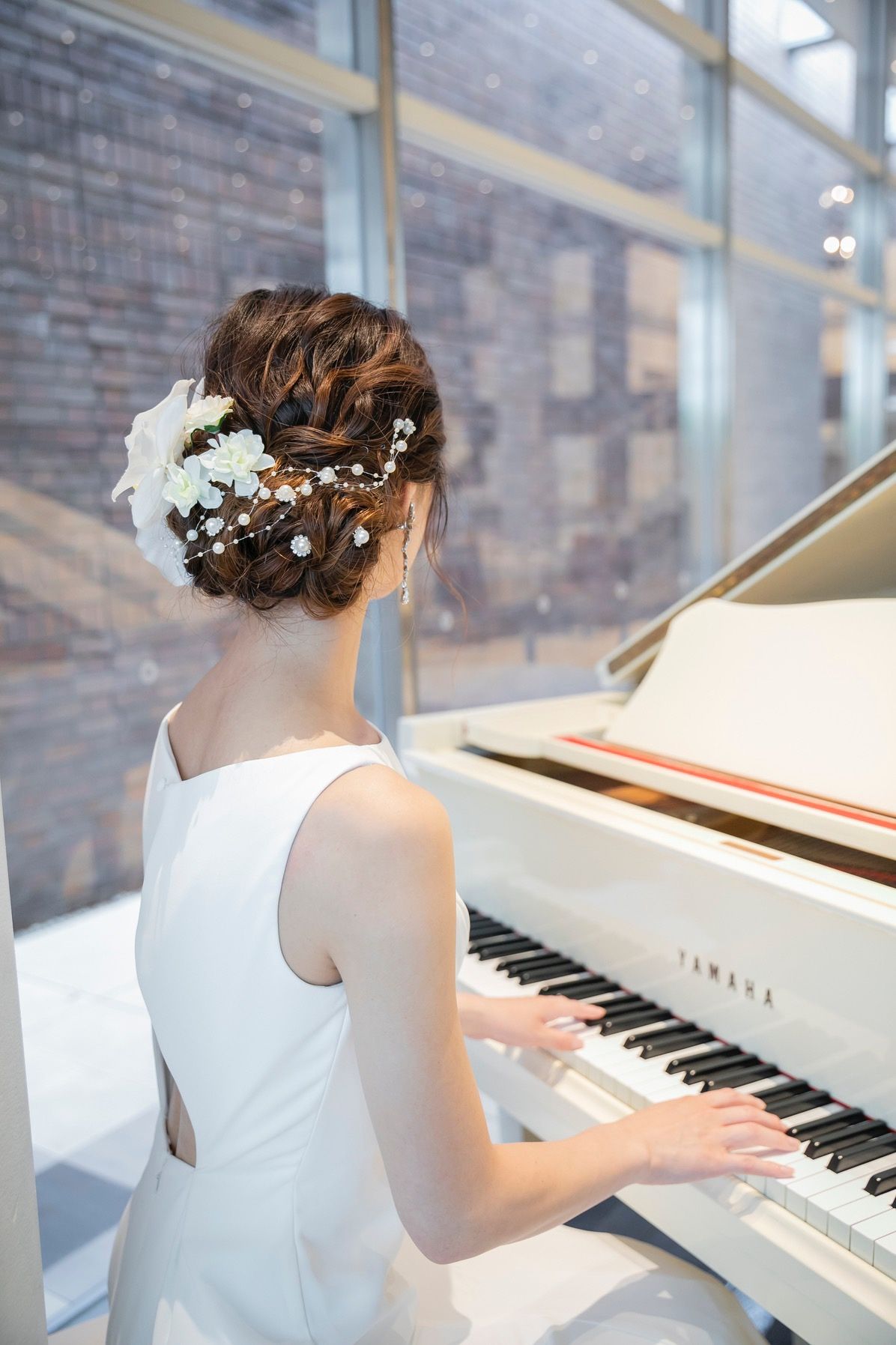 ウェディングドレスは背中のデザインを見せたかったのでアップスタイルにし、カラードレスはローポニーテールの編み込みにしました。
