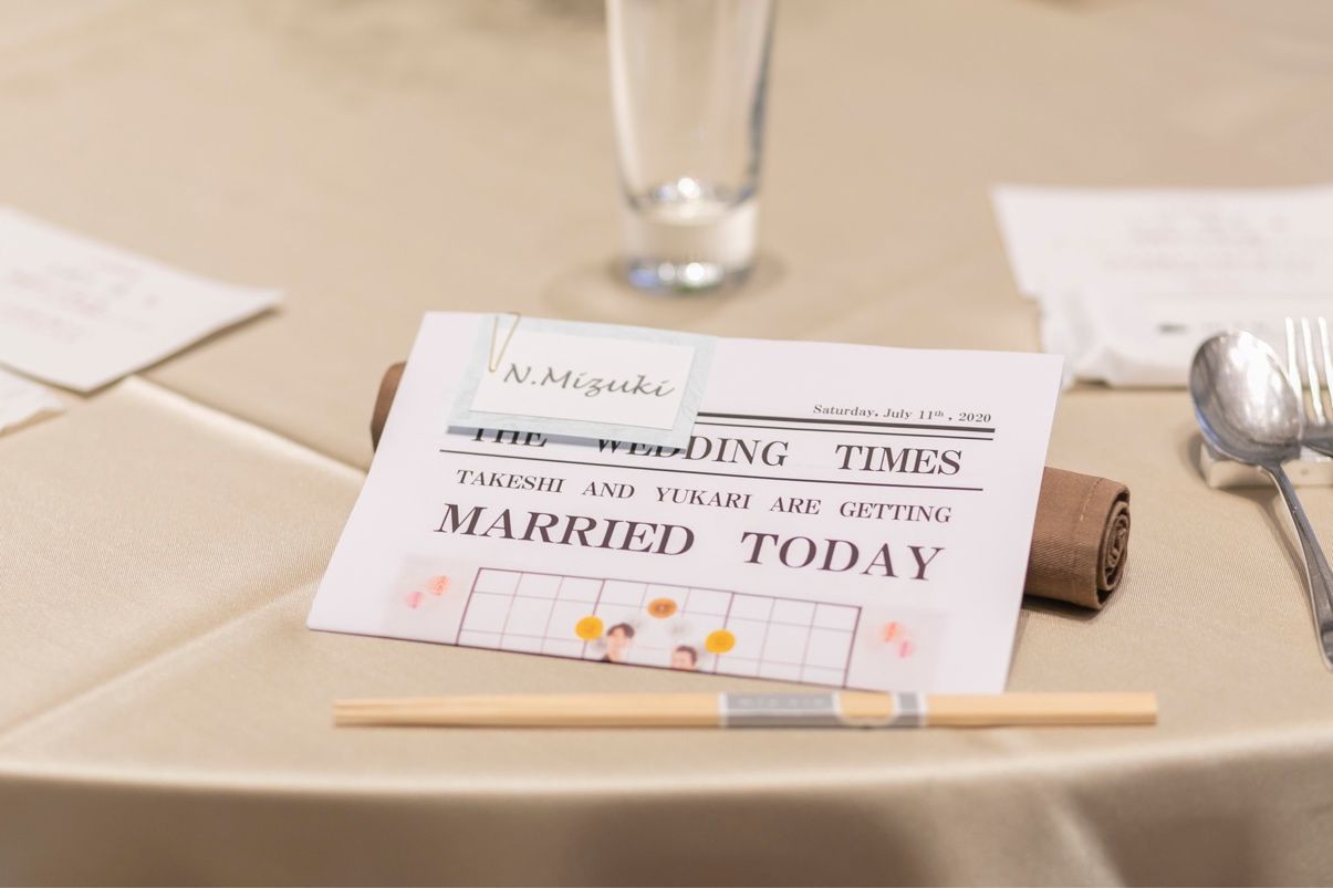 披露宴会場に入る前にエスコートカードを用意し、一人一人へのメッセージと裏にはその人との思い出の写真を載せました。友人同士、親族同士でその写真で話が盛り上がったそうです。ウェディング新聞も作成し、待ち時間を感じさせない工夫をしました。