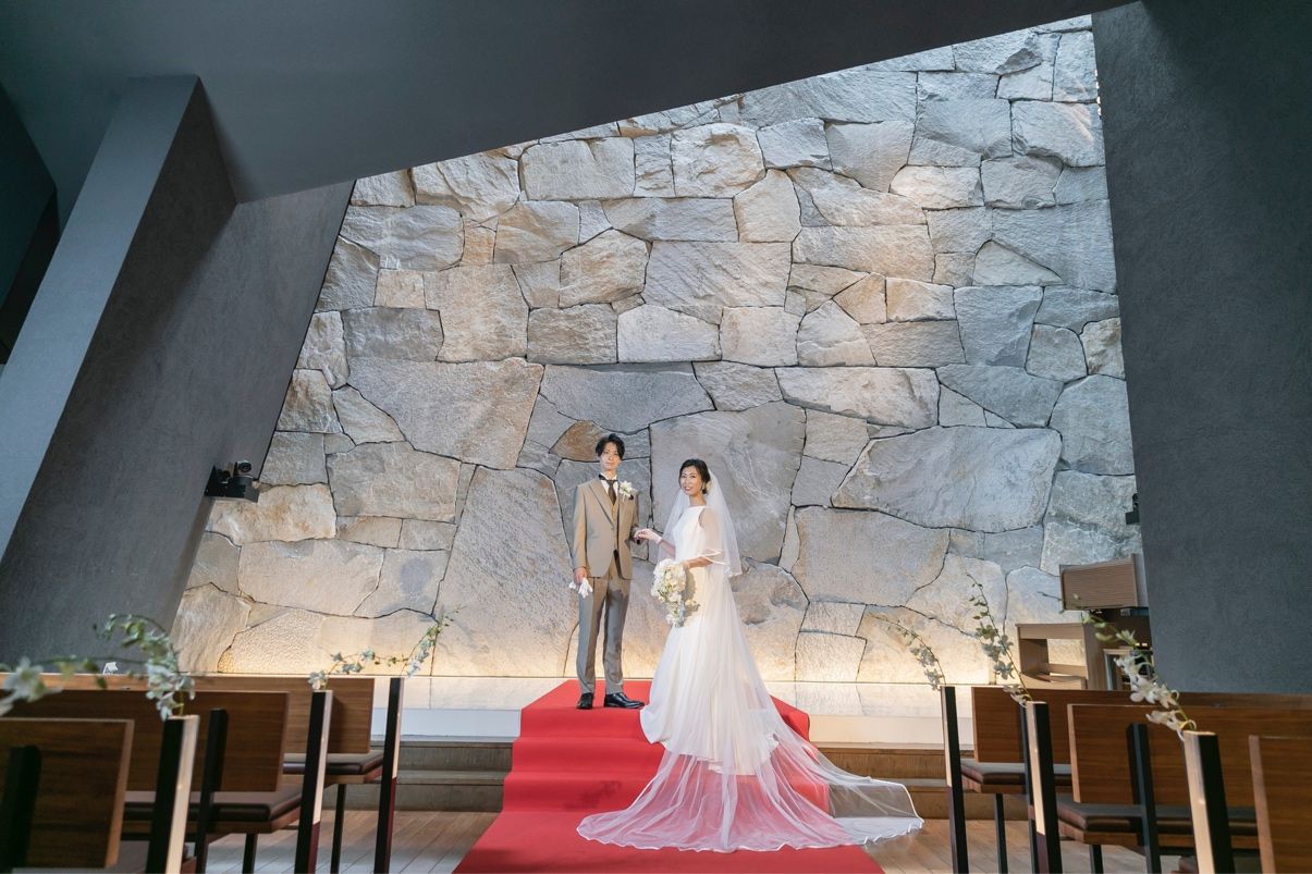 他にはない洞窟のようなチャペルで、扉を開けた時に光が差し込む様はとても幻想的でした。ドレスも白飛びすることなく、チャペルの黒、バージンロードの赤、そしてドレスの白、それぞれがそれぞれの色を映えさせていたと思います。また、石畳を背景に撮った写真はどれも素敵でした。