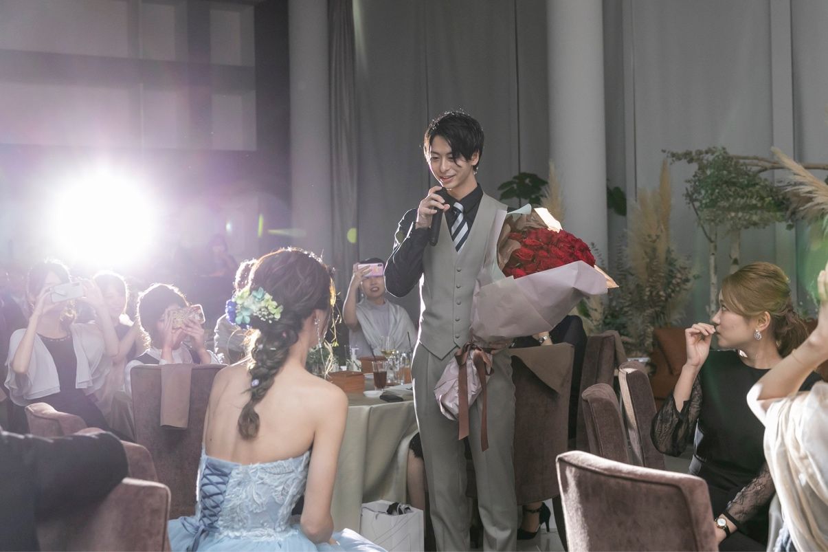 私が通った保育所、小学校、中学校、高校、大学、職場、そして実家からバラを一本ずつ集め、動画の中で披露宴会場に向かって歩いていると思ったら動画は暗転して、バラの花束を持った新郎が披露宴会場の扉から登場し、プロポーズされました。