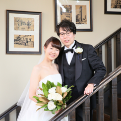 和モダンな会場を活かすために、クラシカルな雰囲気を意識しました。特にお色直しは黒の引き振袖+黒のタキシードで大正ロマンなイメージです。
