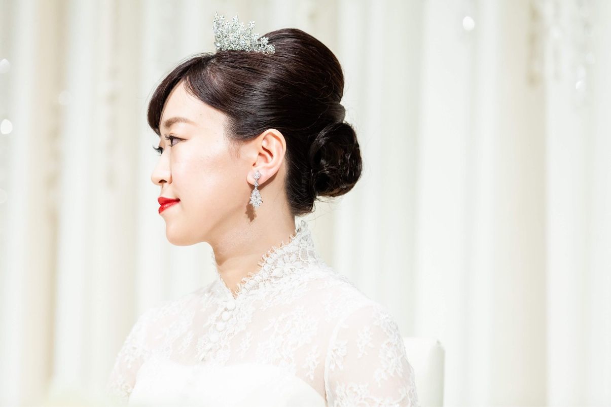 和装とウェディングドレスのヘアは全く同じにし、クラシカルな王道スタイルにしてもらいました。アクセサリーを変えることによって雰囲気が変わり満足しています。カラードレスではトップに高さを出したローポニーテールにしてもらいました。