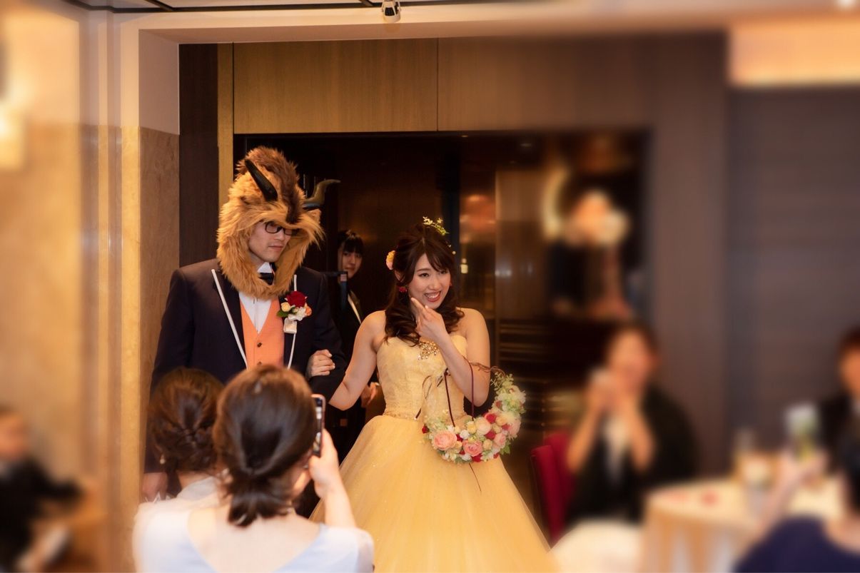 お色直しの際に、新郎は野獣、新婦はベルになり登場。高砂に着くも新郎は野獣のまま。困った新婦は魔法を解こうと考え、子ども達にこえをかけ、子ども達の持っている魔法のスティック(事前に引き出物の袋に入れていた)を使い、子ども達と一緒におまじないの言葉で野獣の魔法を解き新郎が現れる。