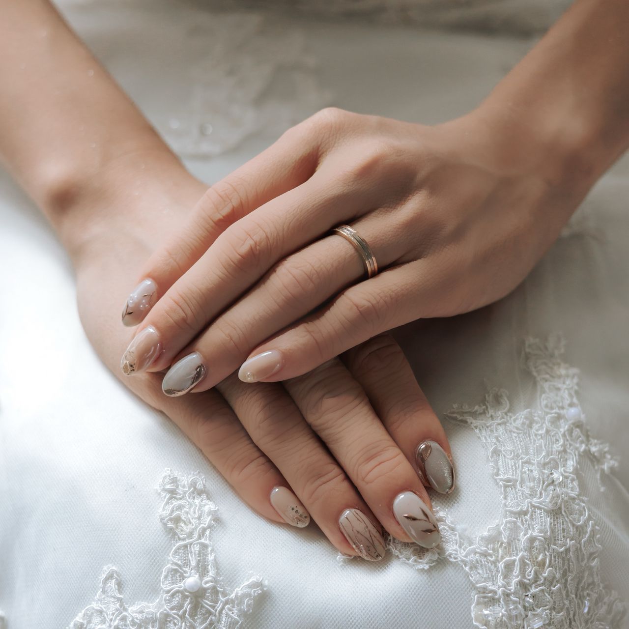 披露宴ではダウンスタイルに合わせたパールシールを💎