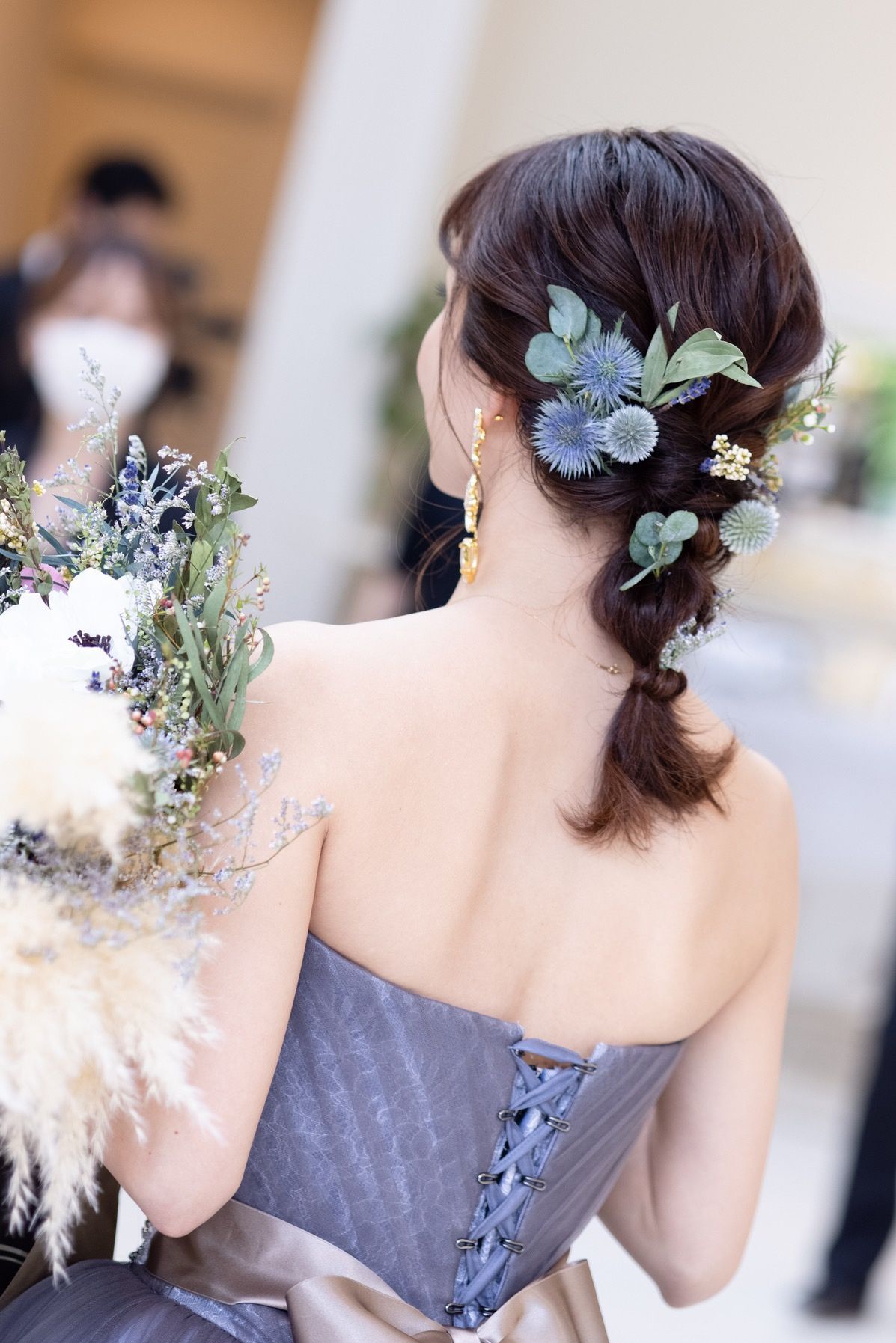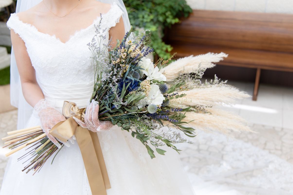 ドライフラワー多めの大きめのクラッチブーケ💐大きいアネモネを入れてもらいました。