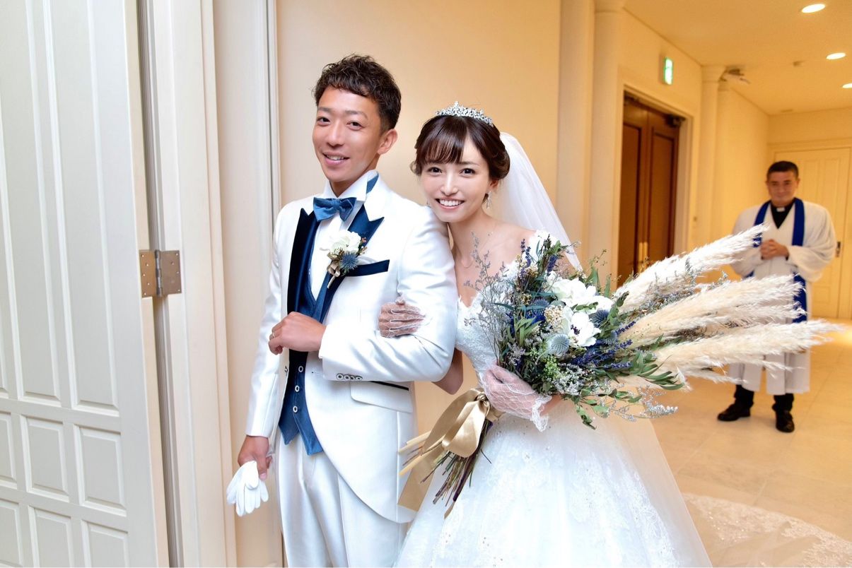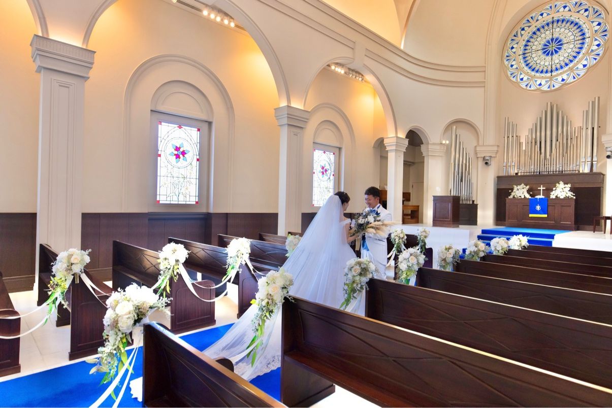 ブルーのバージンロードが可愛く、トレーンが映えます🤍挙式前にオリジナルムービーをチャペルで流すことができて、感動の式が挙げられます!