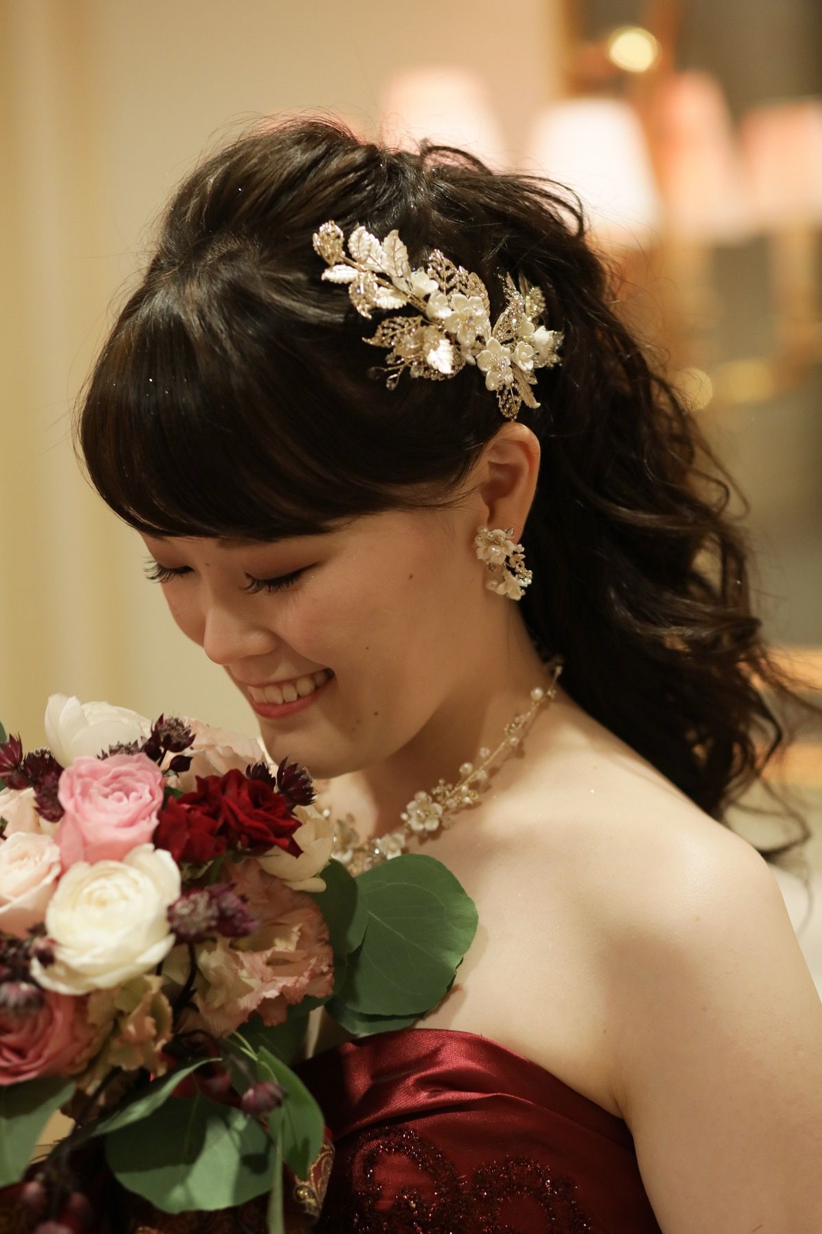 カラードレスのアクセサリー:AnnanWeddingでそろえました。ゴールドのアンティーク調でとても気に入っています。