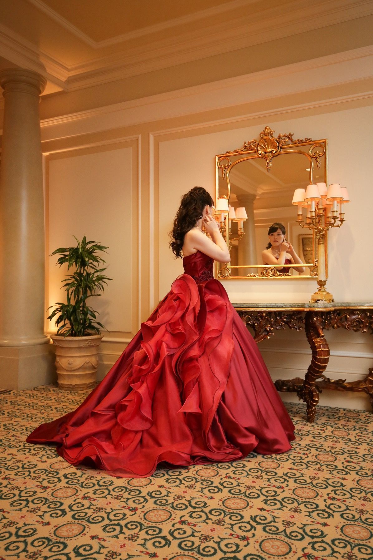 アシンメトリーなフリルがあり、豪華なドレスです。ワインレッドは肌が美しく見えますし、会場にも映える色だと思いました。腹部は濃い色の刺繍があるため、ウエストが細く見えます。