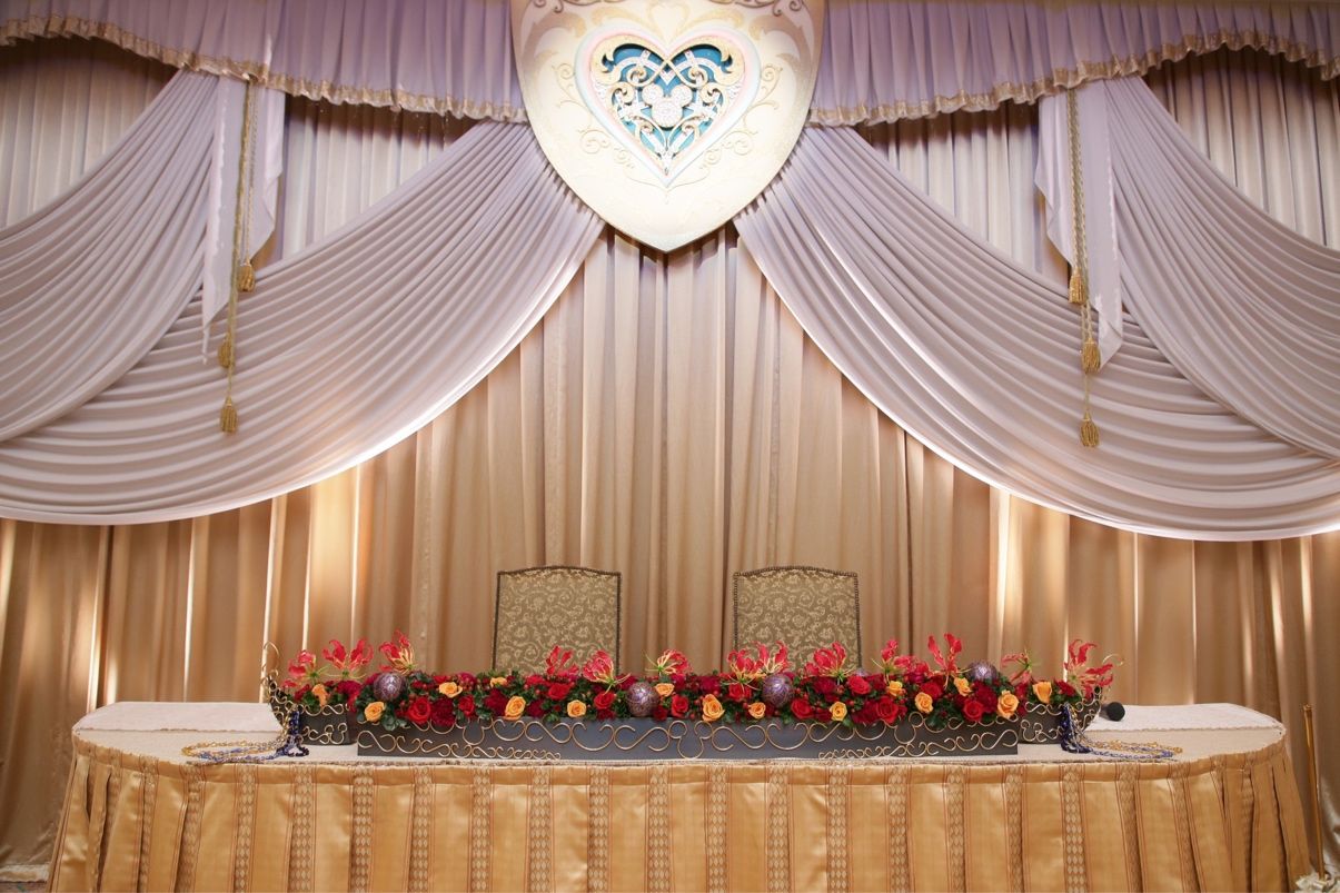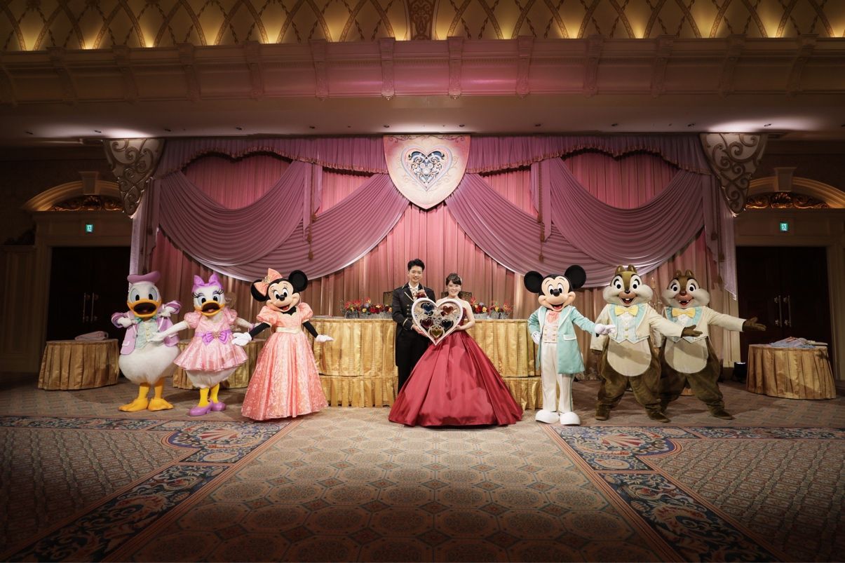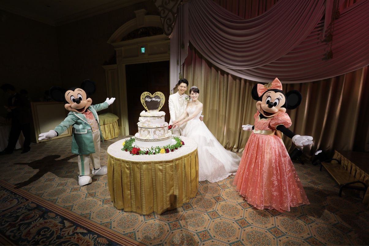 高い天井と大きなシャンデリアが印象的な高級感のある華やかな会場です。内装には隠れミッキーがあり、遊び心もあります。横長のお部屋を選んだのでゲストとの距離も近いように感じました。