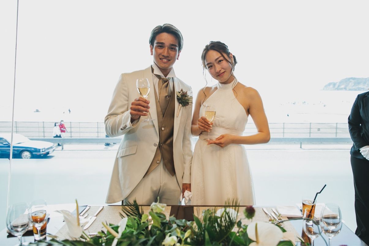 一面に海が広がる会場で開放感があってとてもリラックスできる空間でした。一番のおすすめはやはり海ですが、高砂からゲスト様の席が近く、温かさを感じられるところもおすすめです!