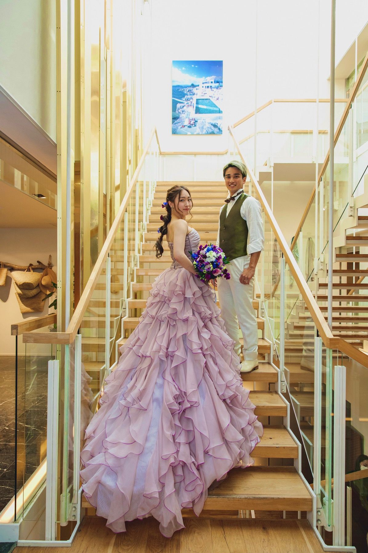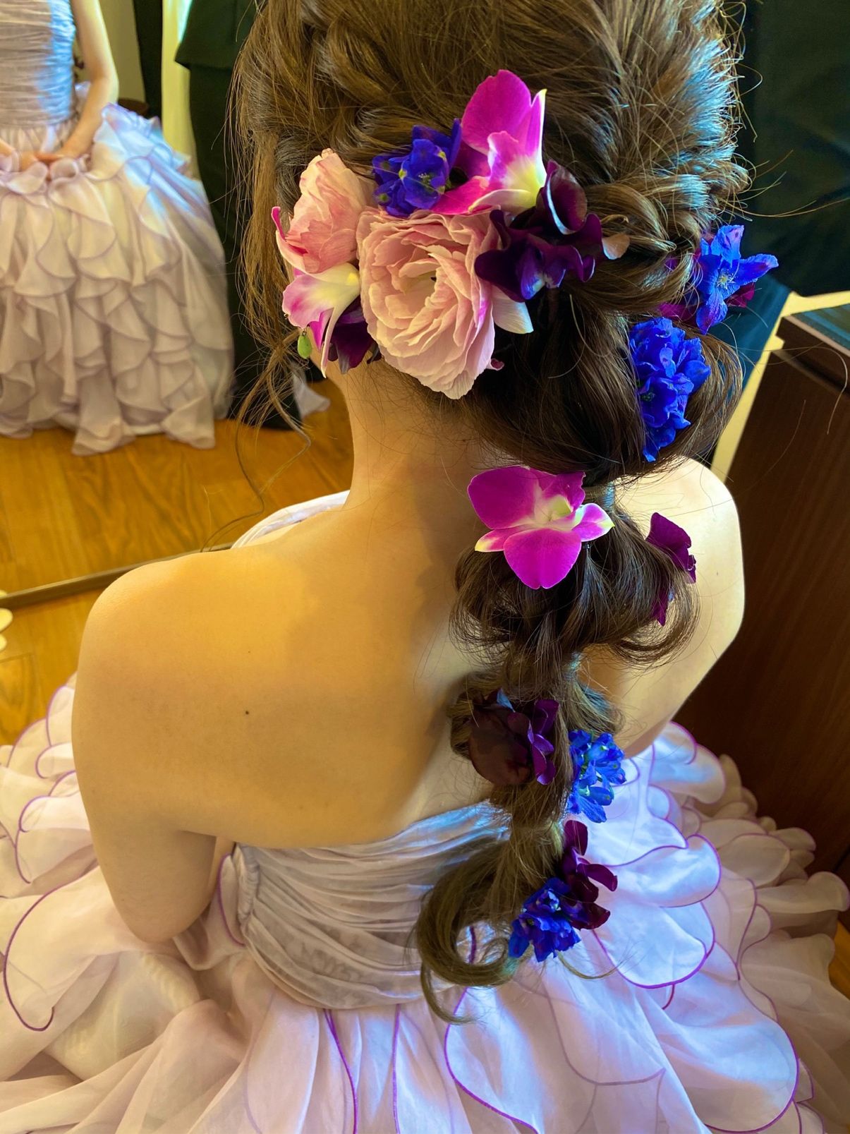 ラベンダー色のヒラヒラがたくさん付いているカラードレスにしました。