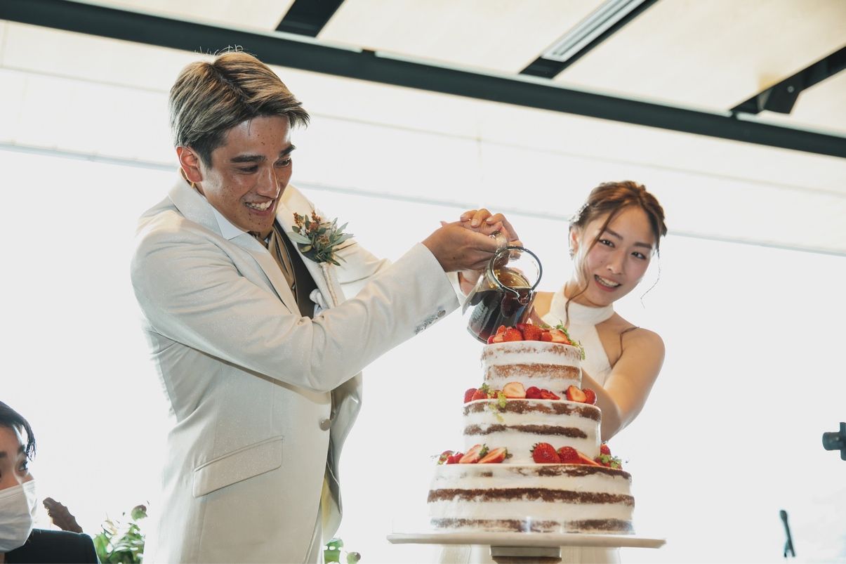 会場の雰囲気がナチュラルだったので、ケーキも自然な色合いがよくて、苺がたくさん乗っている3段のケーキにしました。