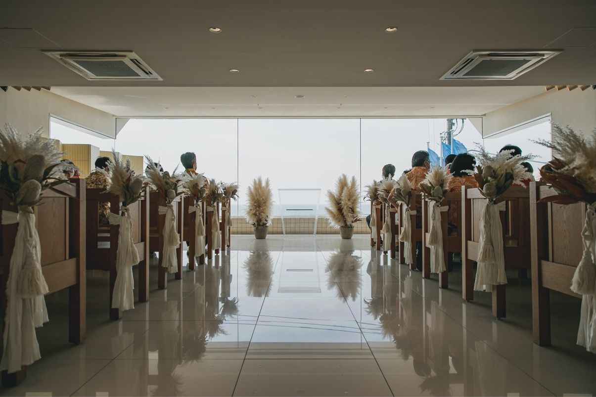 チャペルの壁がガラス張りで、一面に海が広がる開放感のある式場です。チャペルの扉を開けた瞬間の感動は一生忘れないと思います。当日は運良く快晴で最高の景色の中、式を挙げる事ができてとても幸せでした。ゲストの皆様もとても喜んでくれていました!