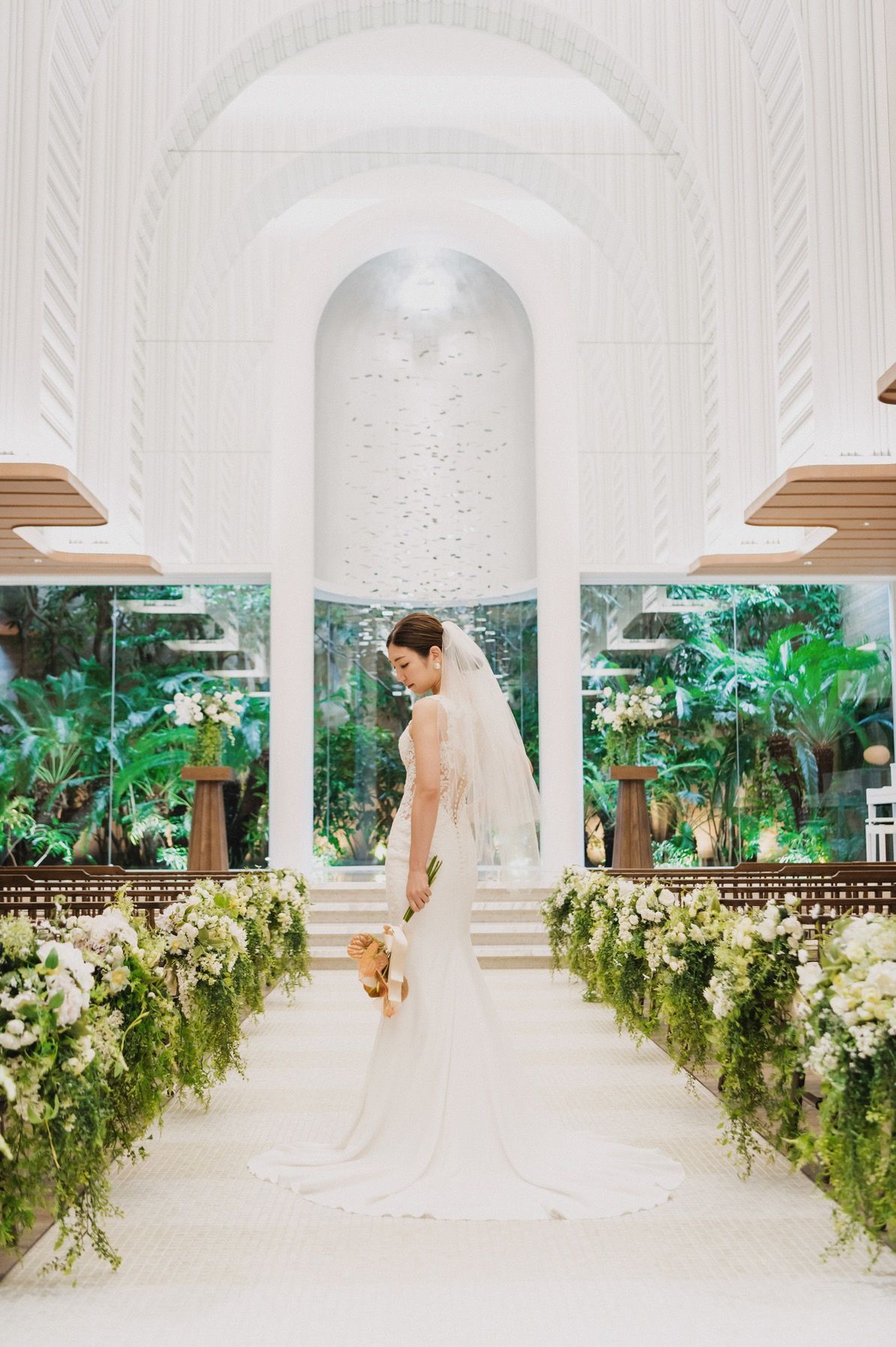 白く洗練された雰囲気のチャペルで、天井も高く開放感があります。サイドには青々としたツリーが配置されていてナチュラルさを感じることが出来ます。