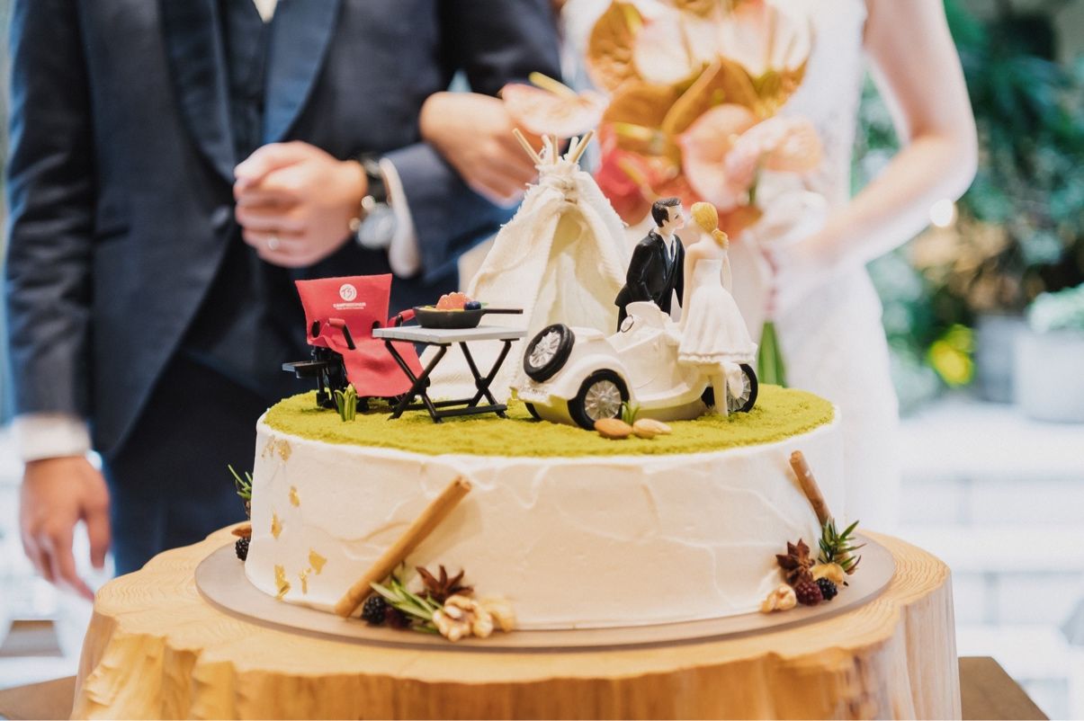 ケーキには強いこだわりがなかったので、二人の趣味であるキャンプっぽくなるよう、ティピーテントのトッパーを自作し、ケーキに乗せてもらいました。