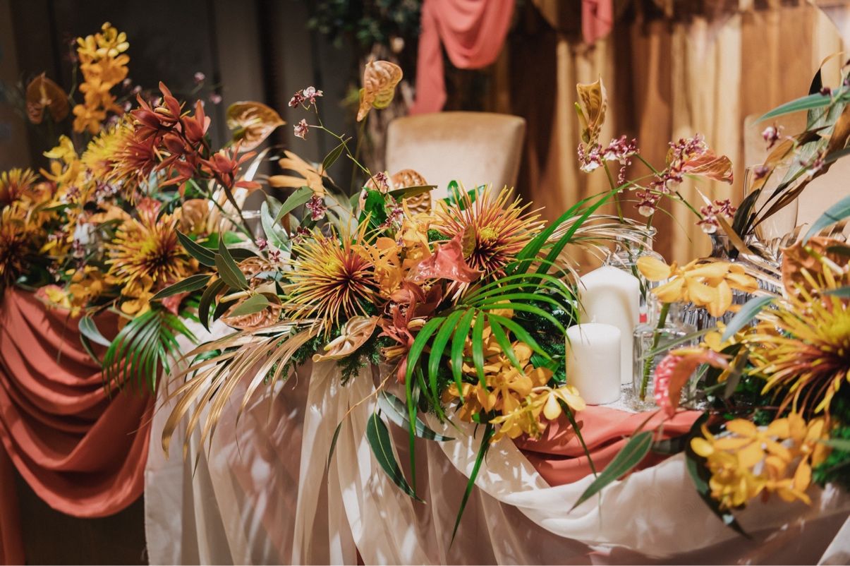 イメージは夏の夕暮れ、夏から秋にかけてのエモーショナルな雰囲気がいいとオーダーしました。テラコッタカラーのジョーゼット布を高砂バックに使いたかったので、それと調和のとれる装花でお願いしますとオーダーしました。