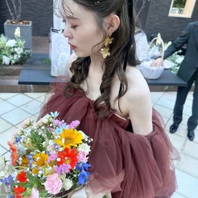 胸元にボリュームがあるドレスだったので最初はアップスタイルで考えていたのですが、4年間伸ばし続けた髪の毛を活かしたいのと意外にもダウンスタイルが合っていたのでこのヘアに決定しました。