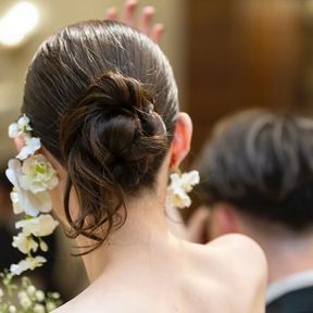ヘアは王道シニヨンから、毛先をちょっと出してアシンメトリーにしてかちっとしすぎず抜け感のあるヘアにしてもらいました。
