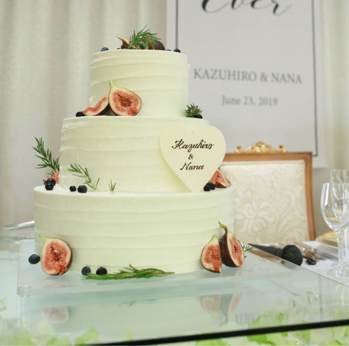もともと青山セントグレースさんのデザインのなかにあるものを少しアレンジを変えてもらい、いちじくとブルーベリーの三段のケーキにしました。