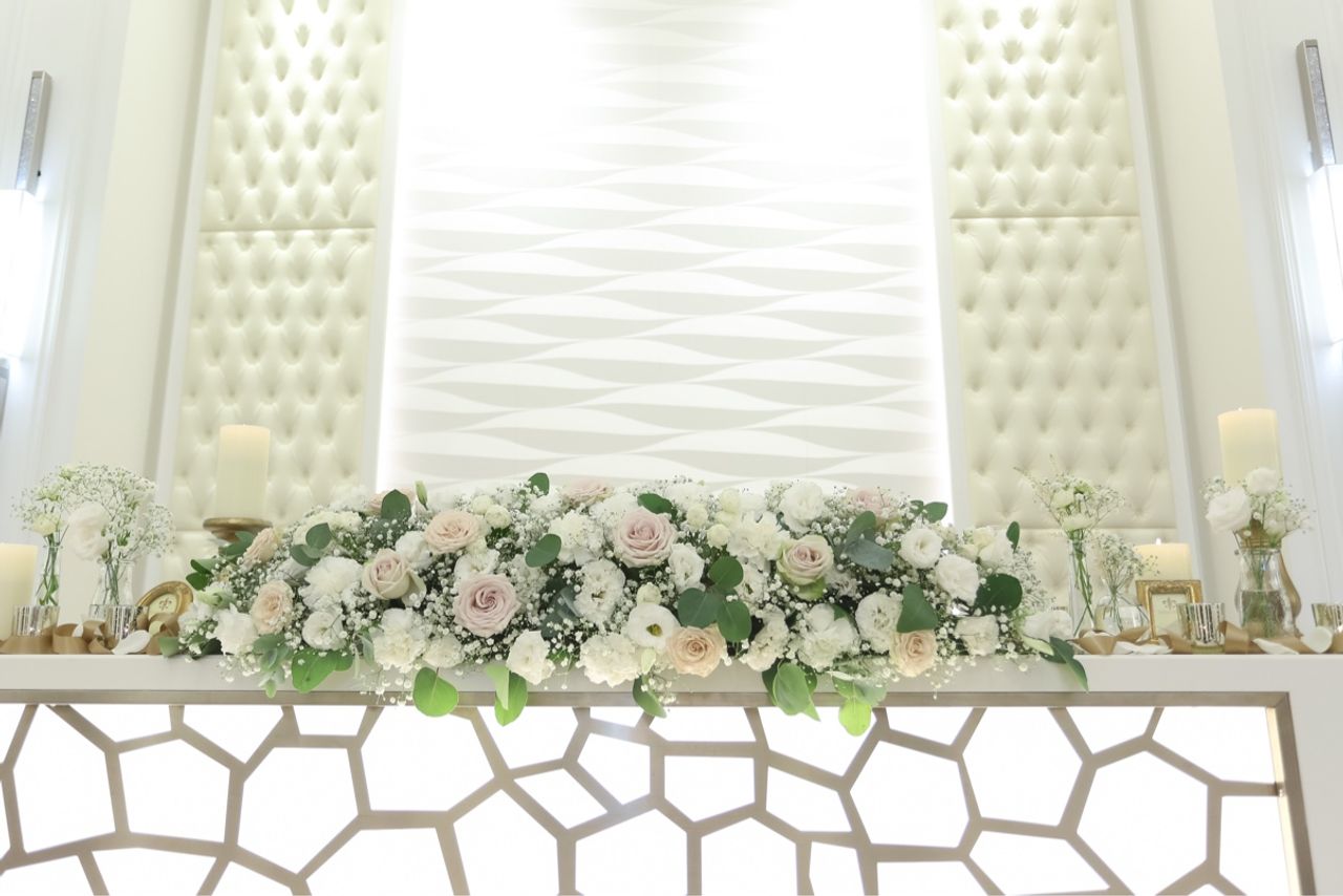 あまりいろんな色や派手な色を使いたくなかったので白、緑を基調にくすんだピンクのバラも少し入れてもらいました。