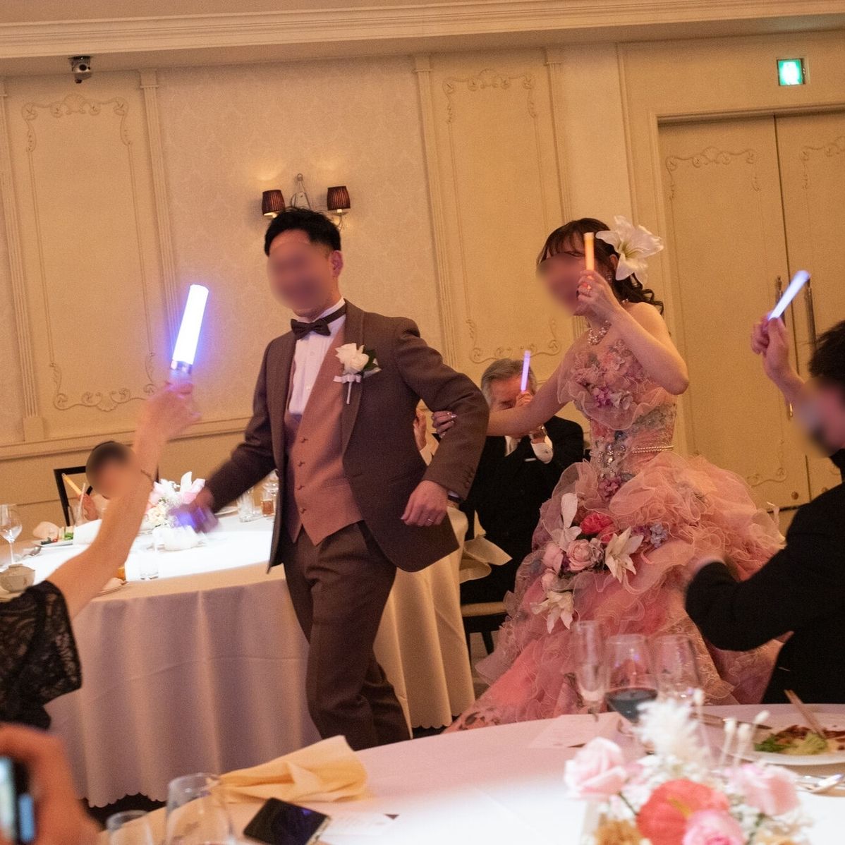 お色直し後の再入場の時、アイドルソングを流してゲストにサイリウムを振ってもらうという演出をしたのですが、夫側のゲストにそのアイドルに詳しい方がいたようで、何人かでMIXを打って、コールもしてくれて感動しました。事前に演出のことは伝えていないので、その場で急遽やってくれたのだと思いますが、とてもビックリして一生の思い出になりました。